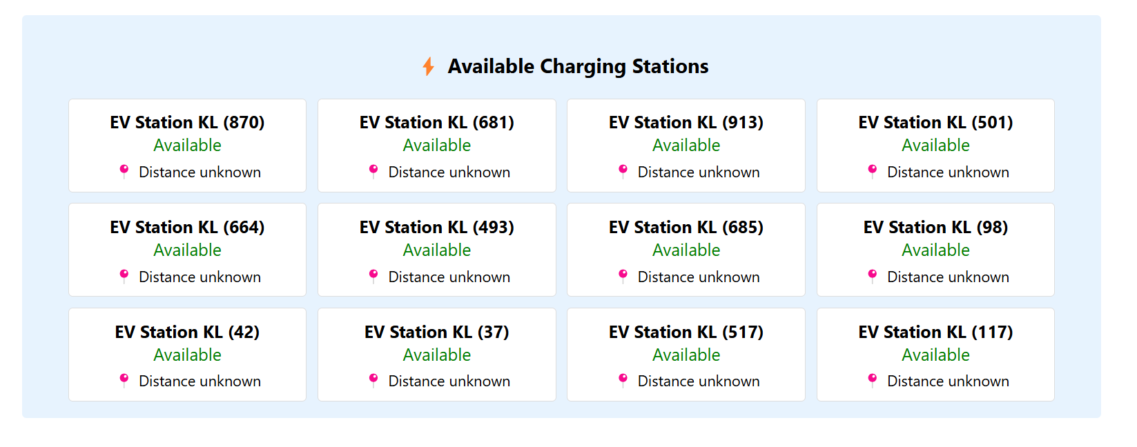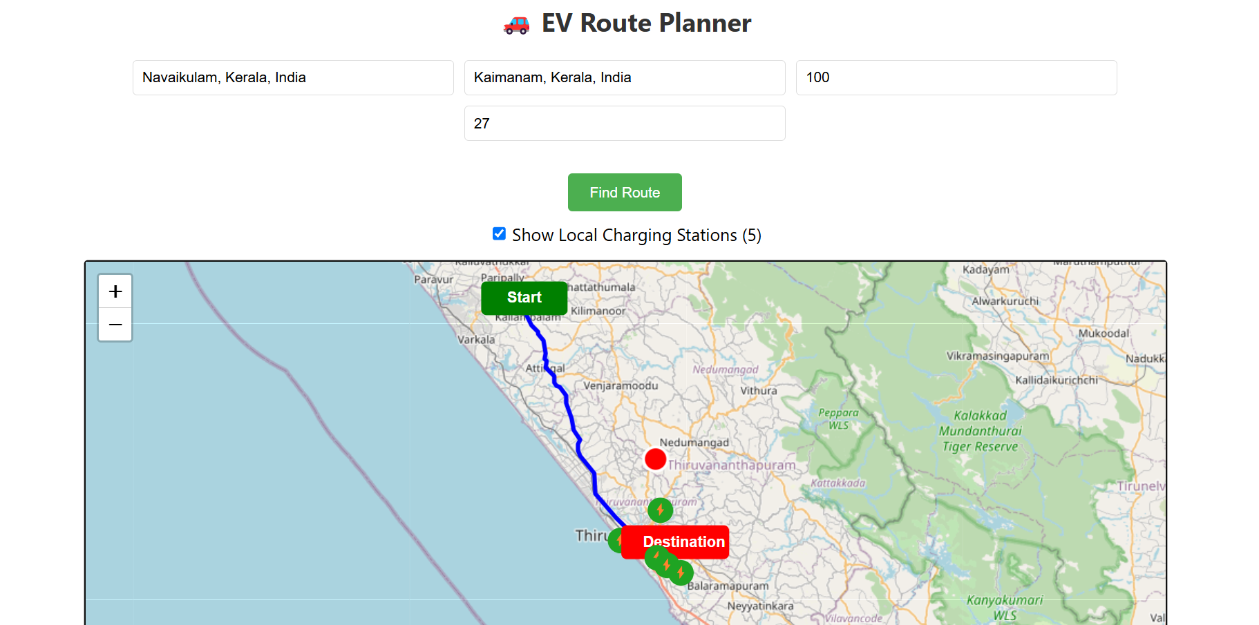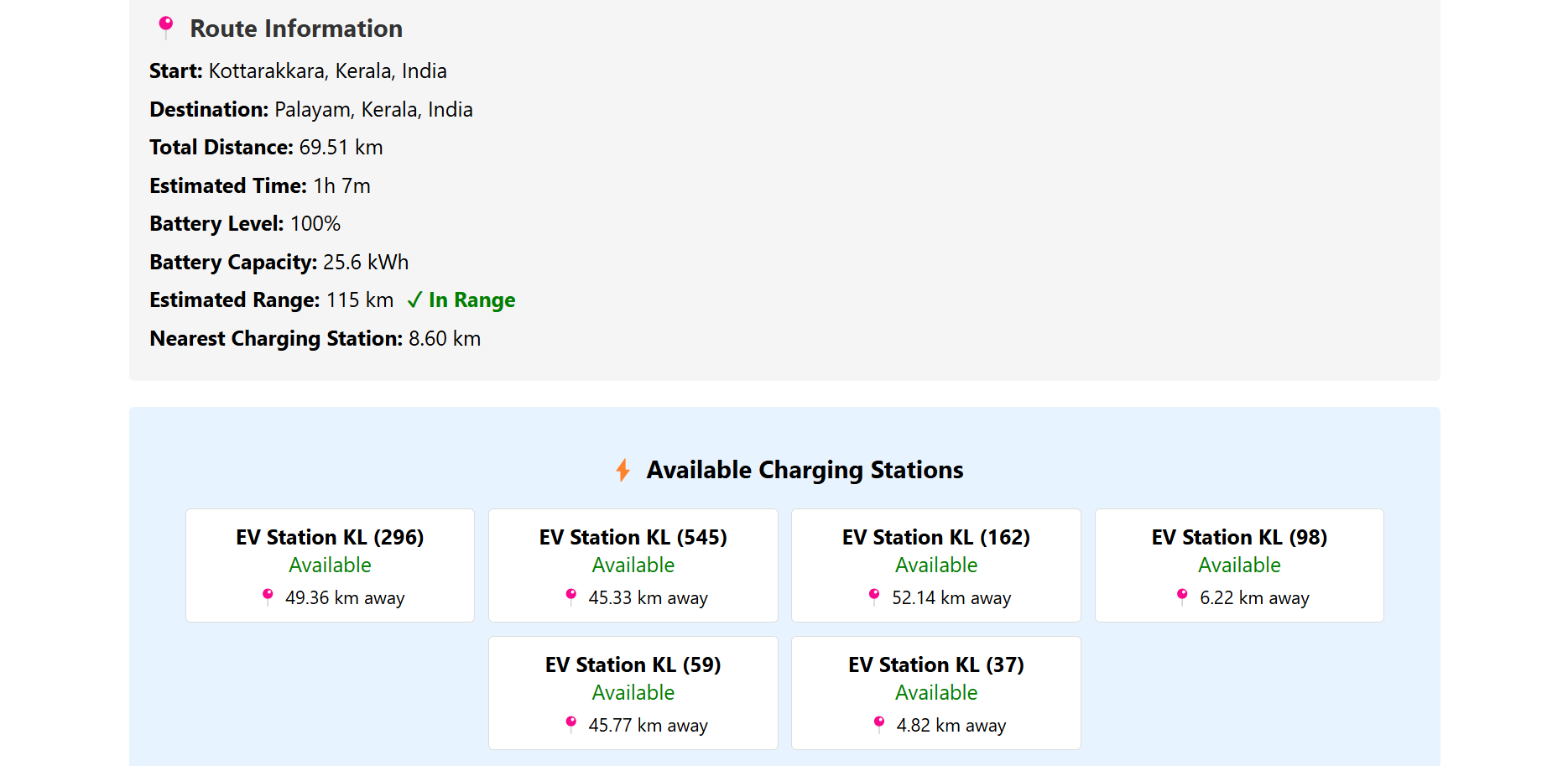 Geocoding to fetch the co-ordinates of the start and end locations Fetch routes and charging station based on users current location Predict range of EV using a RandomForest regression model Use the RL model to find the most optimal route or suggest stopping at a charging station Store the route and charging station