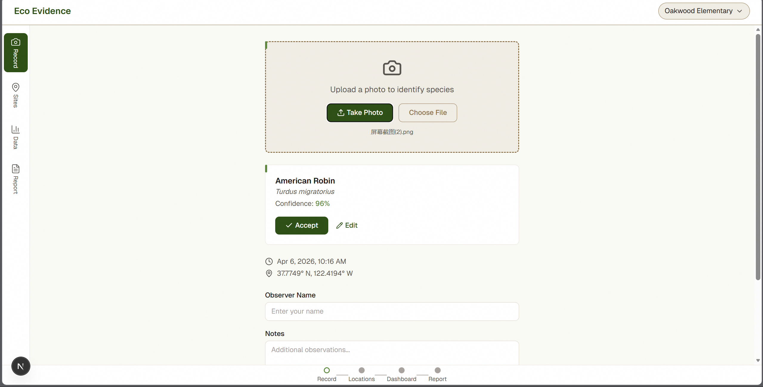 - Record — Upload a photo. AI identifies the species (via iNaturalist Computer Vision API). GPS and timestamp are captured automatically.