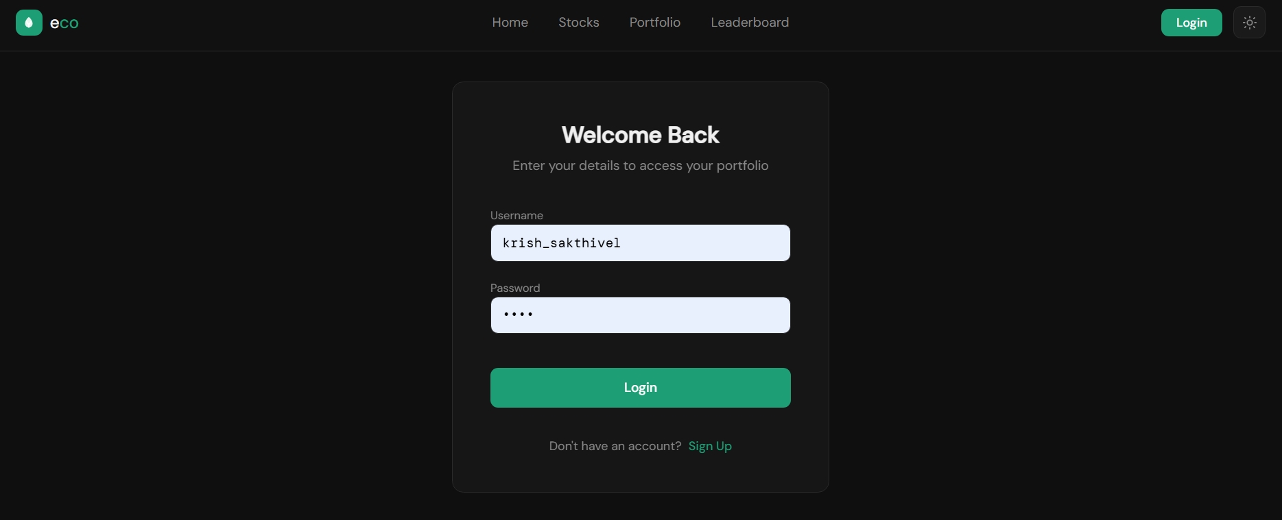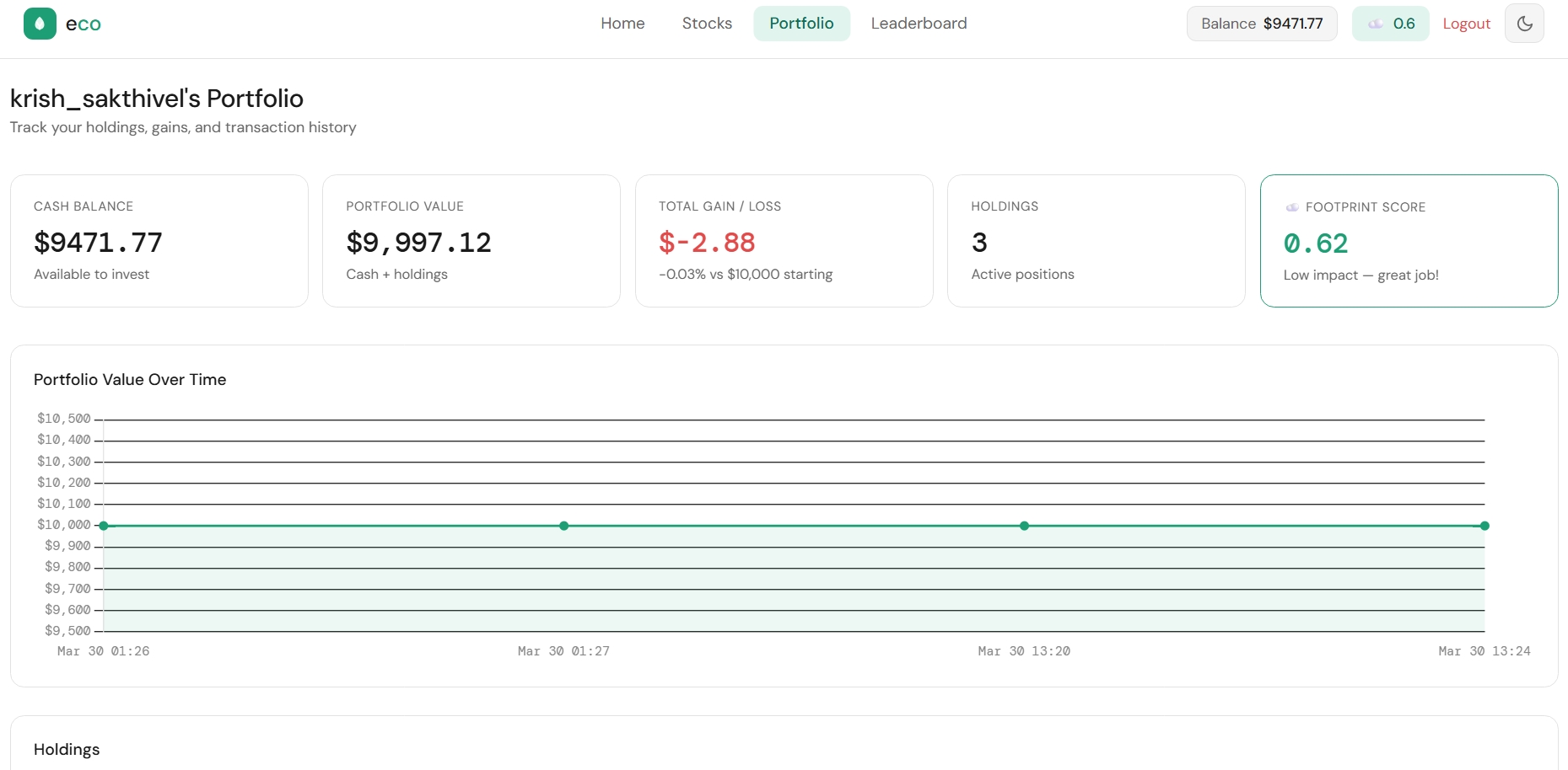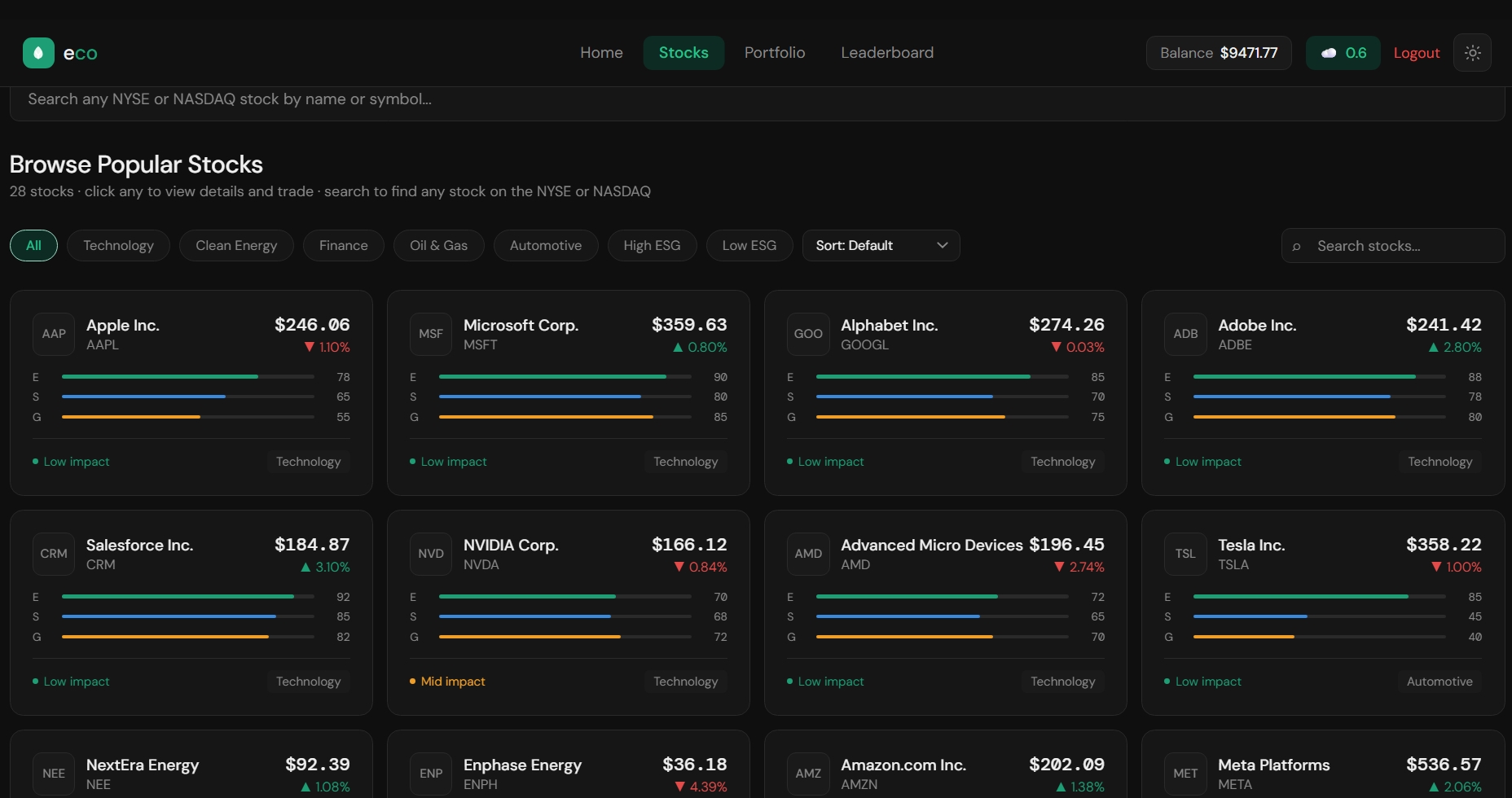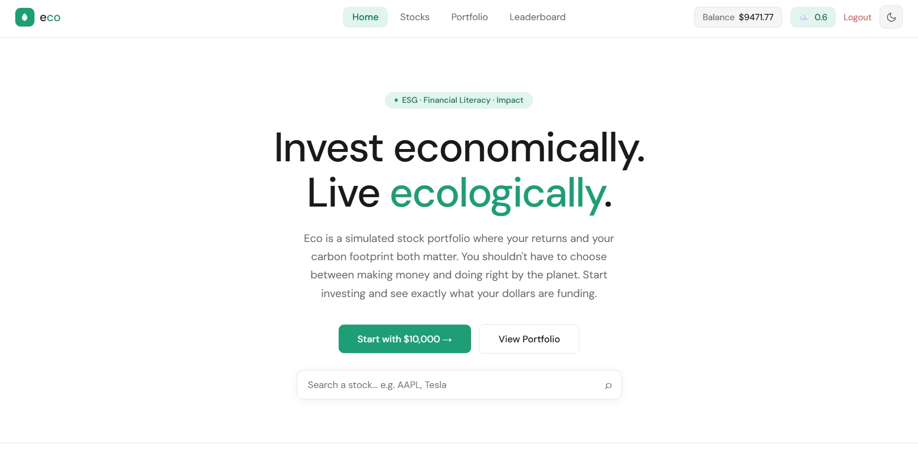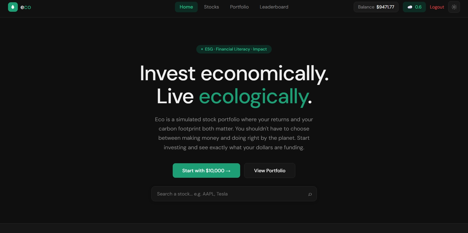 Eco is a proof-of-concept that we can have a platform that can spread financial literacy and how to not blur the line between money and ethics. We want to stop people from blindly investing in and funding companies that aren't ethical with respect to the environment, and also teach them about variables in stocks that can help them make money beyond investing in those companies. We want to help play a part in ethical investing, and that starts now.