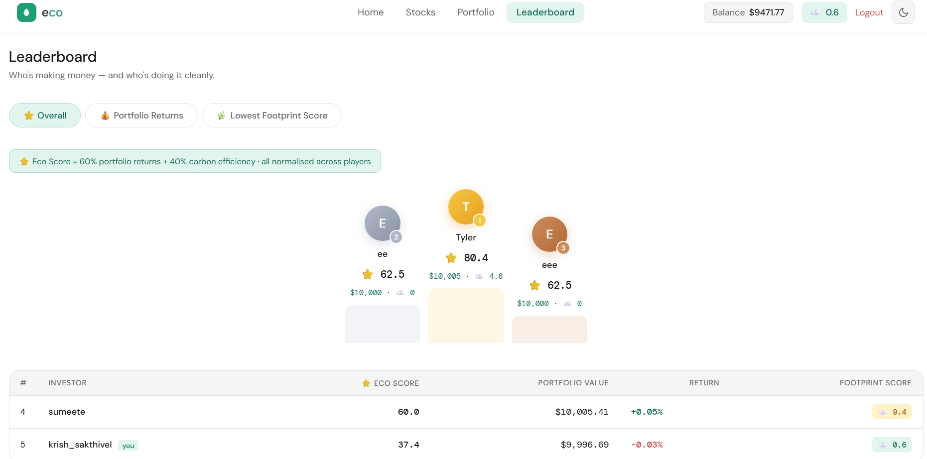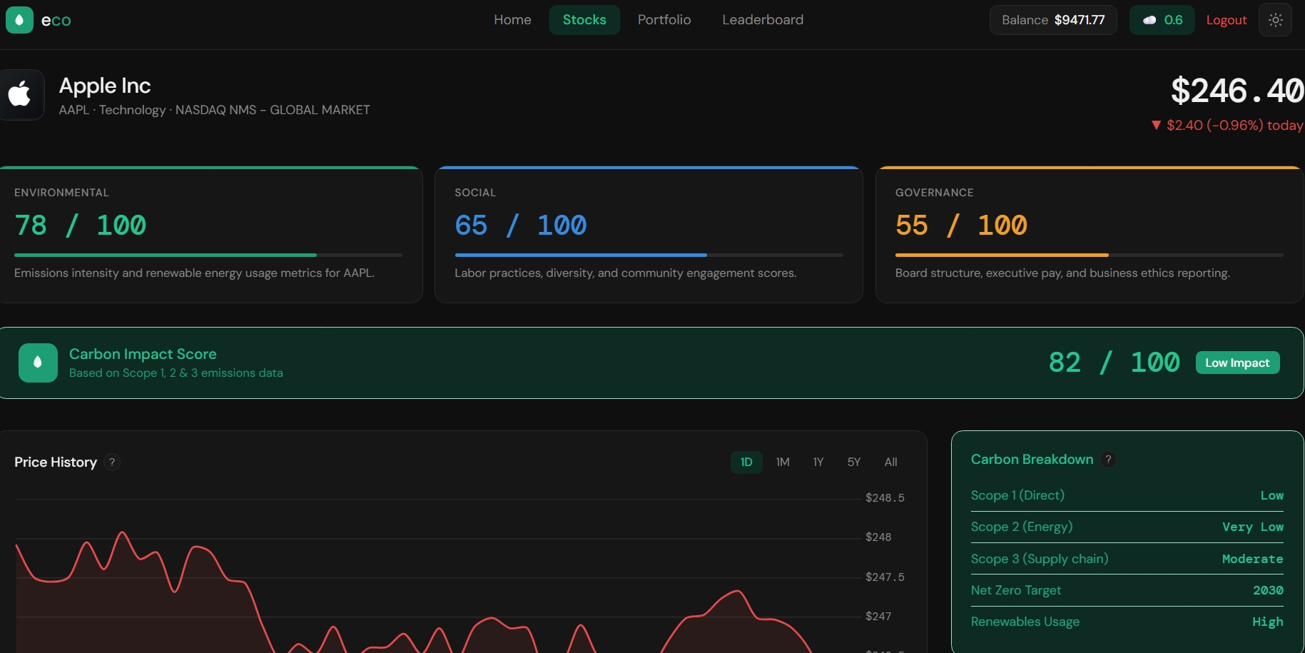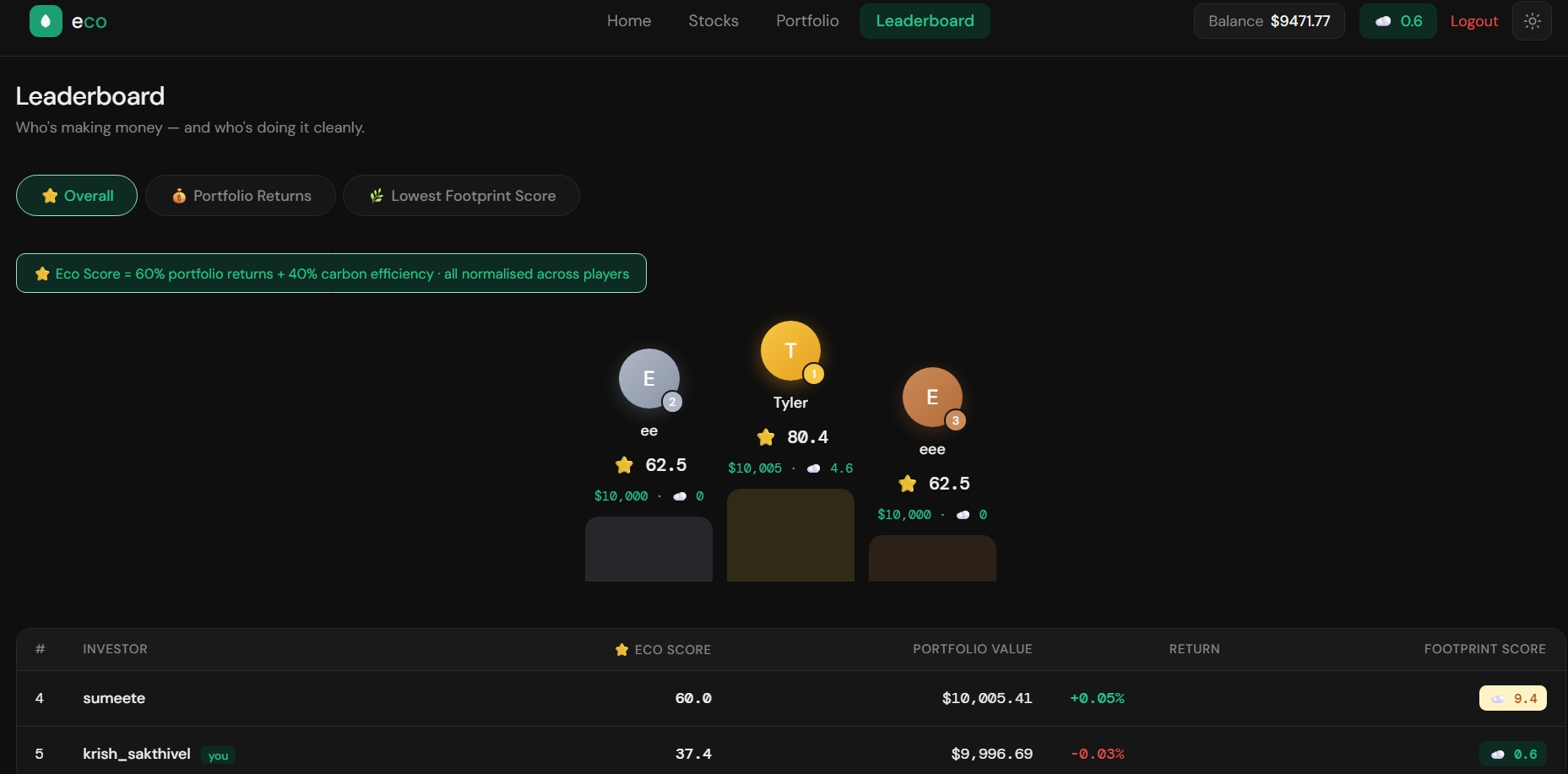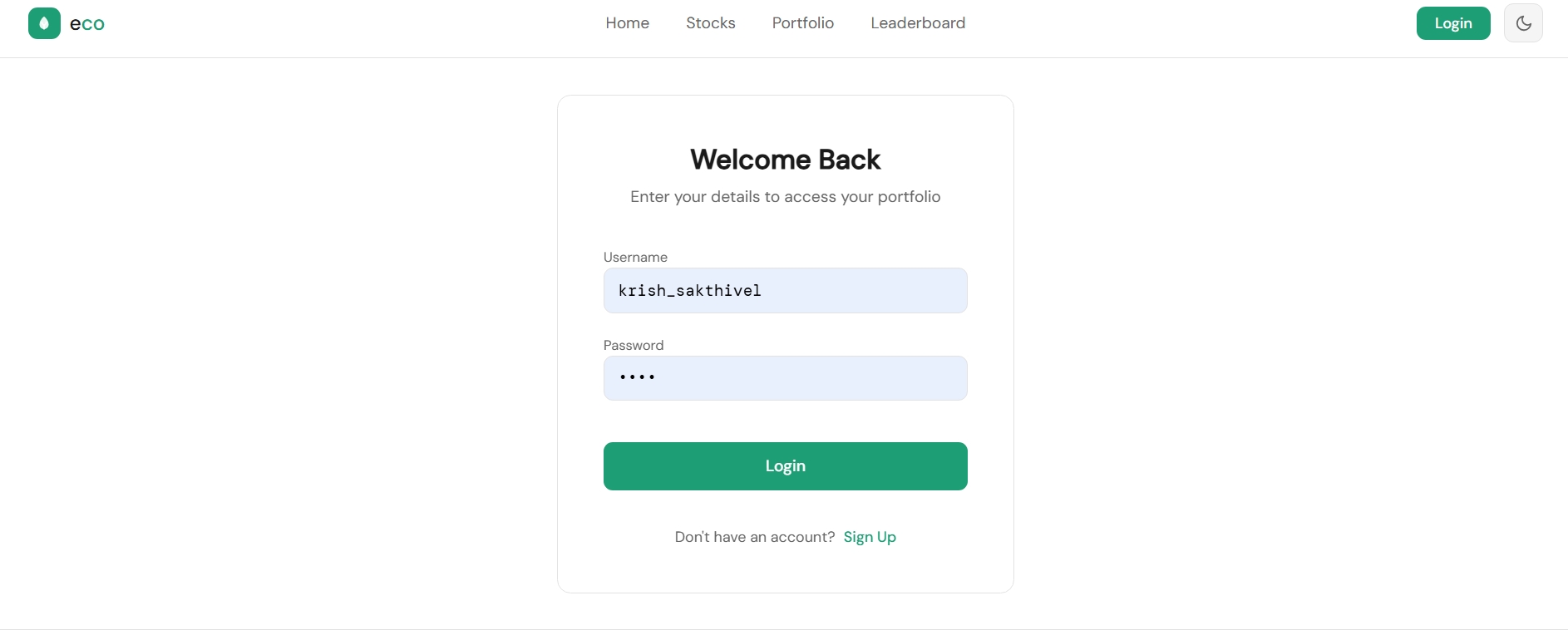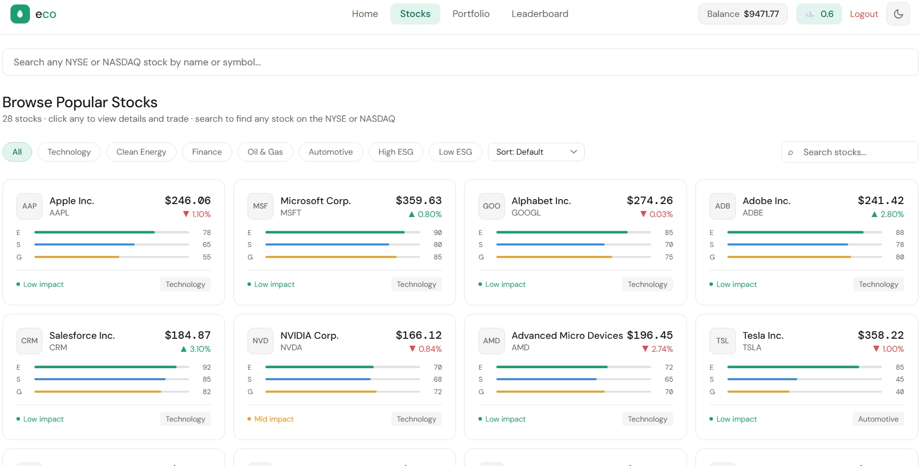 Eco is a proof-of-concept that we can have a platform that can spread financial literacy and how to not blur the line between money and ethics. We want to stop people from blindly investing in and funding companies that aren't ethical with respect to the environment, and also teach them about variables in stocks that can help them make money beyond investing in those companies. We want to help play a part in ethical investing, and that starts now.