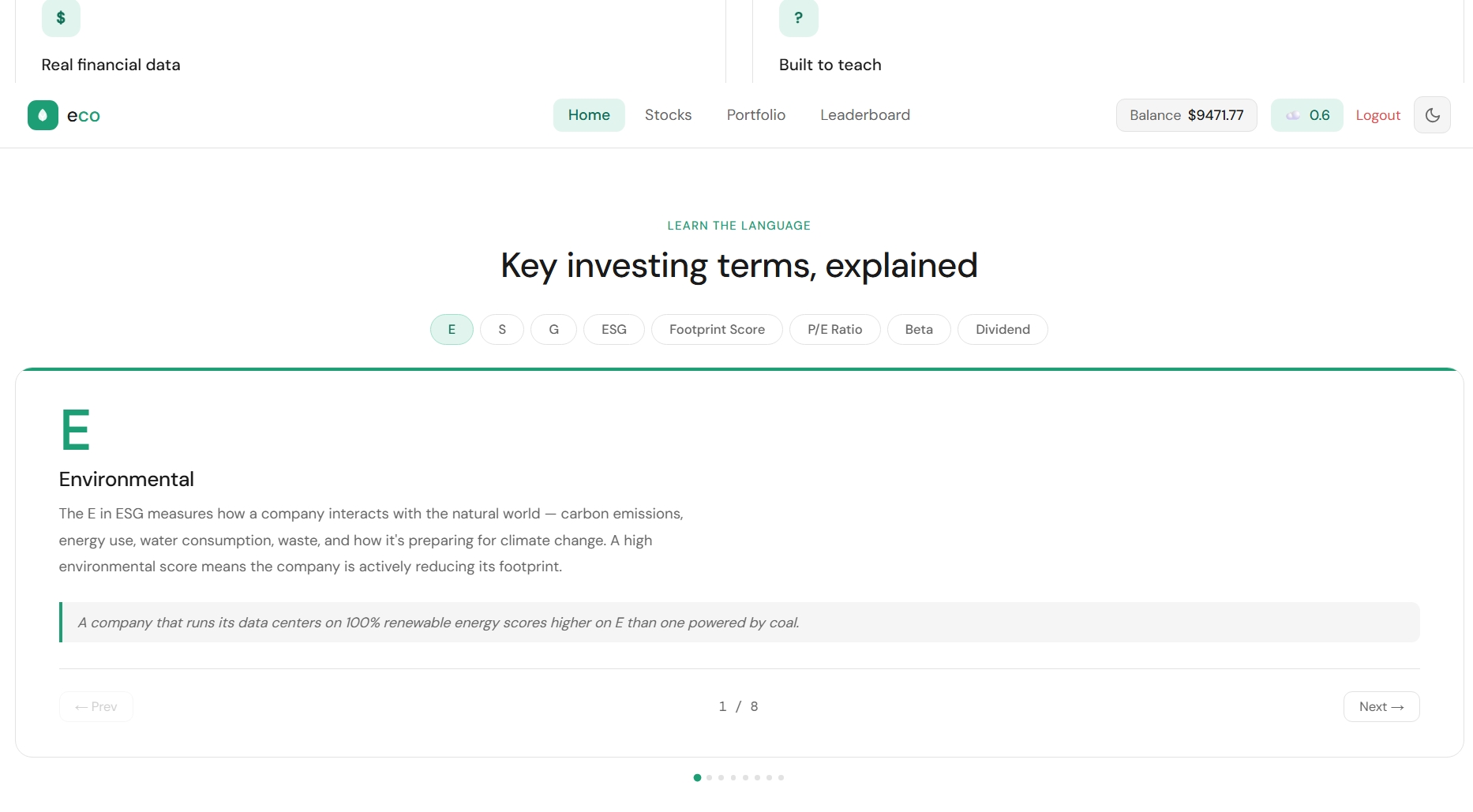 Eco is more than just a tool; it's a platform students can use to learn how to invest hands-on while keeping the environmental aspect in mind. People can: