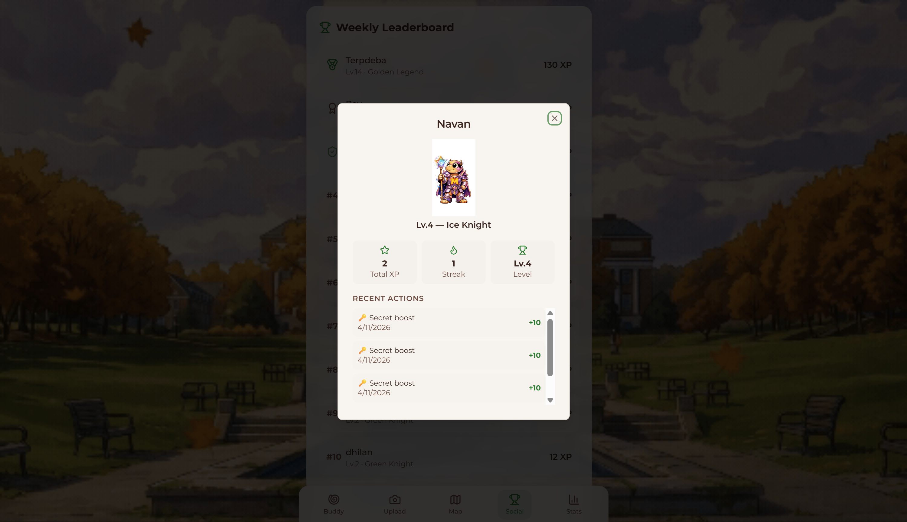 - Expand beyond UMD by creating school-specific versions of EcoBuddy, each with its own custom branding, mascot, and logo to make the experience feel exclusive and personalized