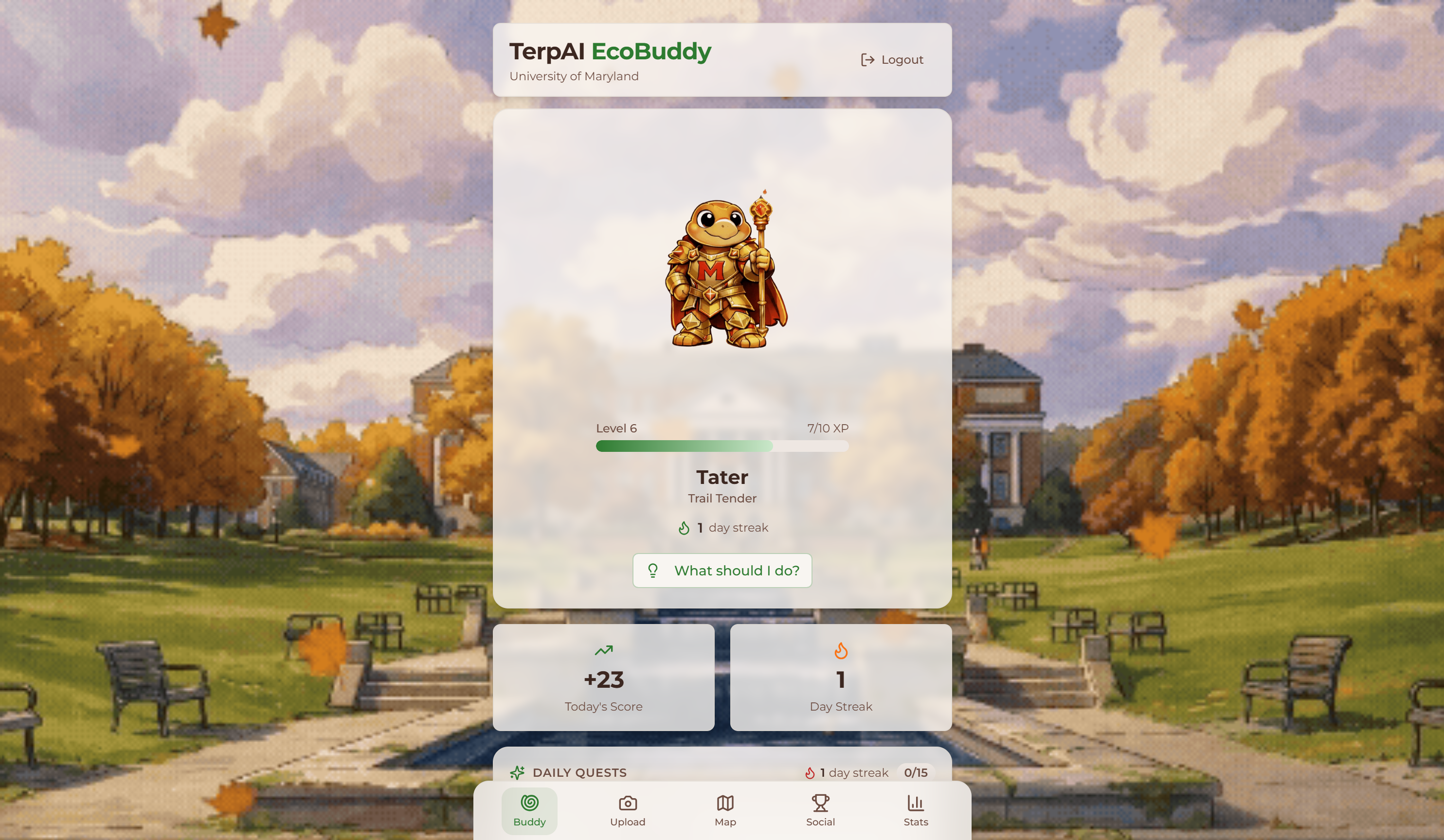 We were inspired by a simple problem: people want to be environmentally sustainable, but there’s no easy, engaging way to track and feel rewarded for those actions in daily life. At a campus like UMD, students make small decisions every day—walking instead of driving, recycling, conserving energy—but those actions often go unnoticed. We wanted to turn sustainability into something visible, interactive, and motivating—like a game. By combining AI, real-world behavior tracking, and a virtual companion, EcoBuddy was born.