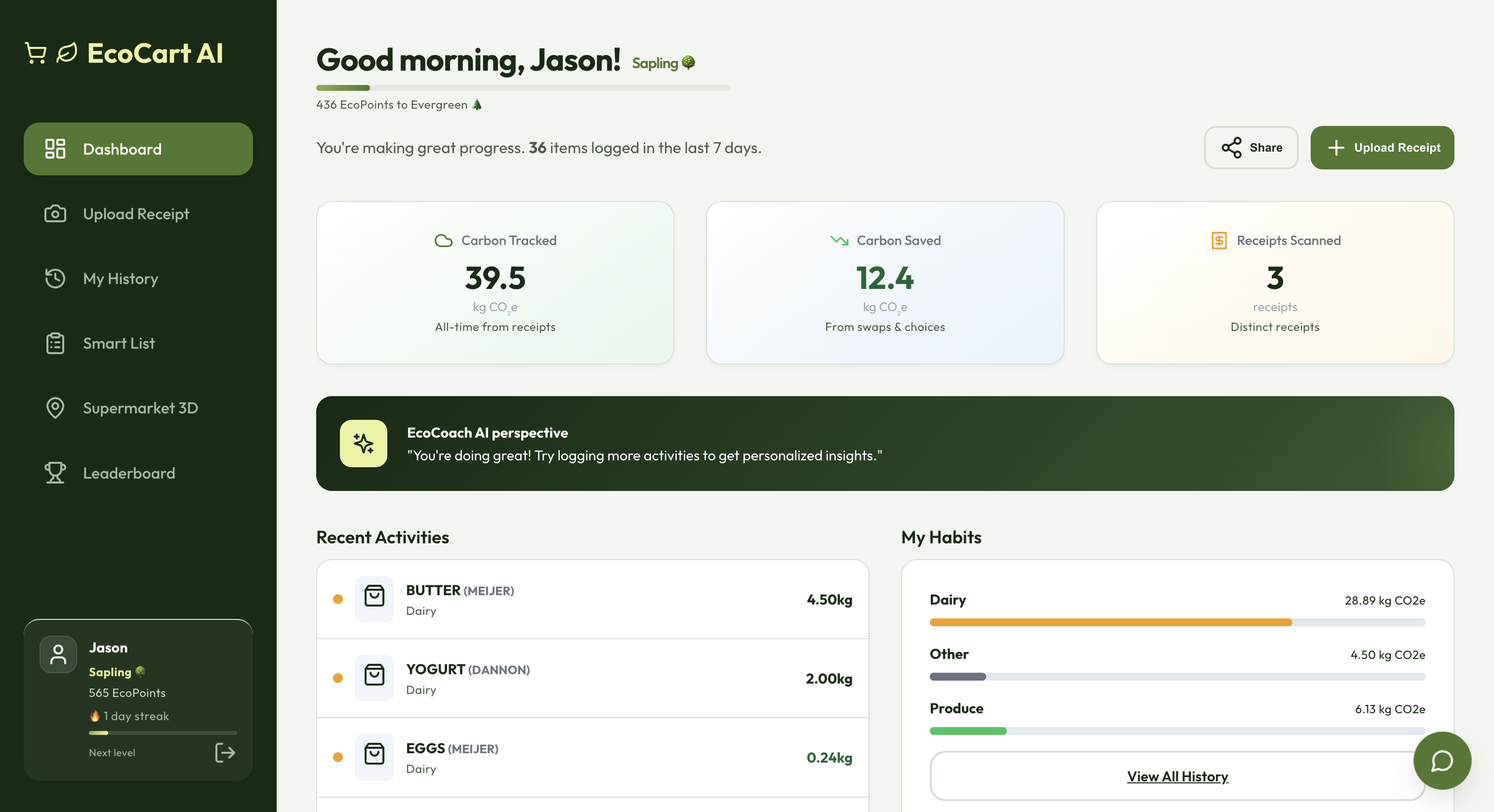 Every year, the average American household generates over 8.1 metric tons of CO₂ from food alone — yet most people have no idea which items in their grocery cart are the biggest offenders. We kept asking ourselves, what if the receipt you throw away after every grocery run could actually teach you something?