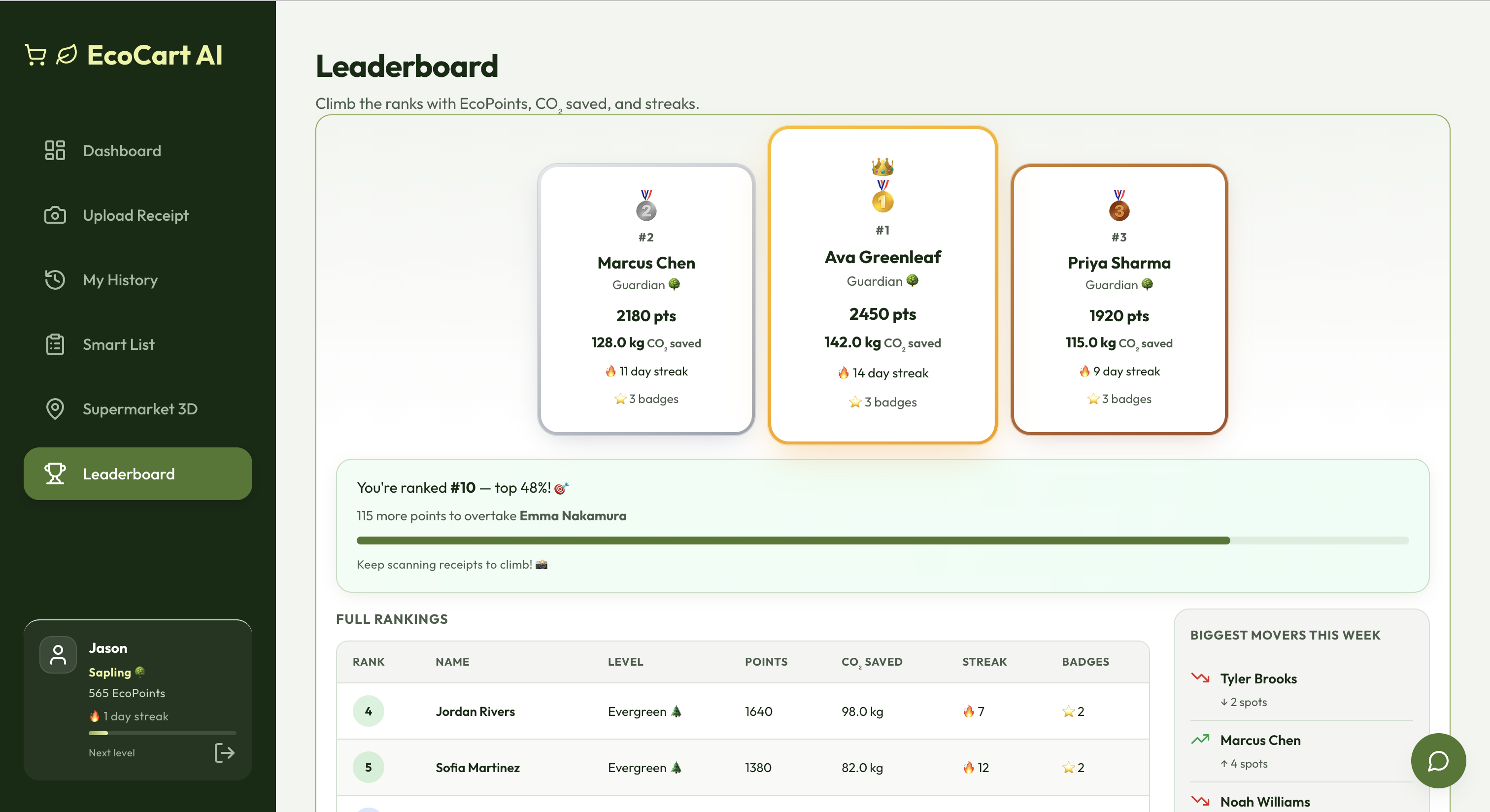 - Full gamification loop: Points, streaks, 7 earnable badges, levels from Seedling to Guardian, and a 20-person leaderboard that makes carbon tracking feel like a game.