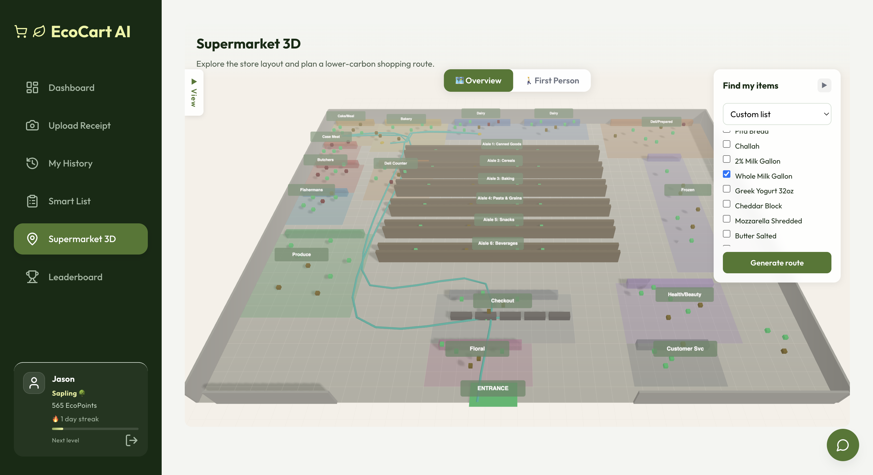 3D Supermarket Navigation A full Three.js-powered 3D model of a real grocery store, built from an actual floorplan. Users can select items from their receipt and generate an optimized walking route through the store using a zone-based sweep algorithm that minimizes backtracking. Eco-friendly products glow green on the shelves.