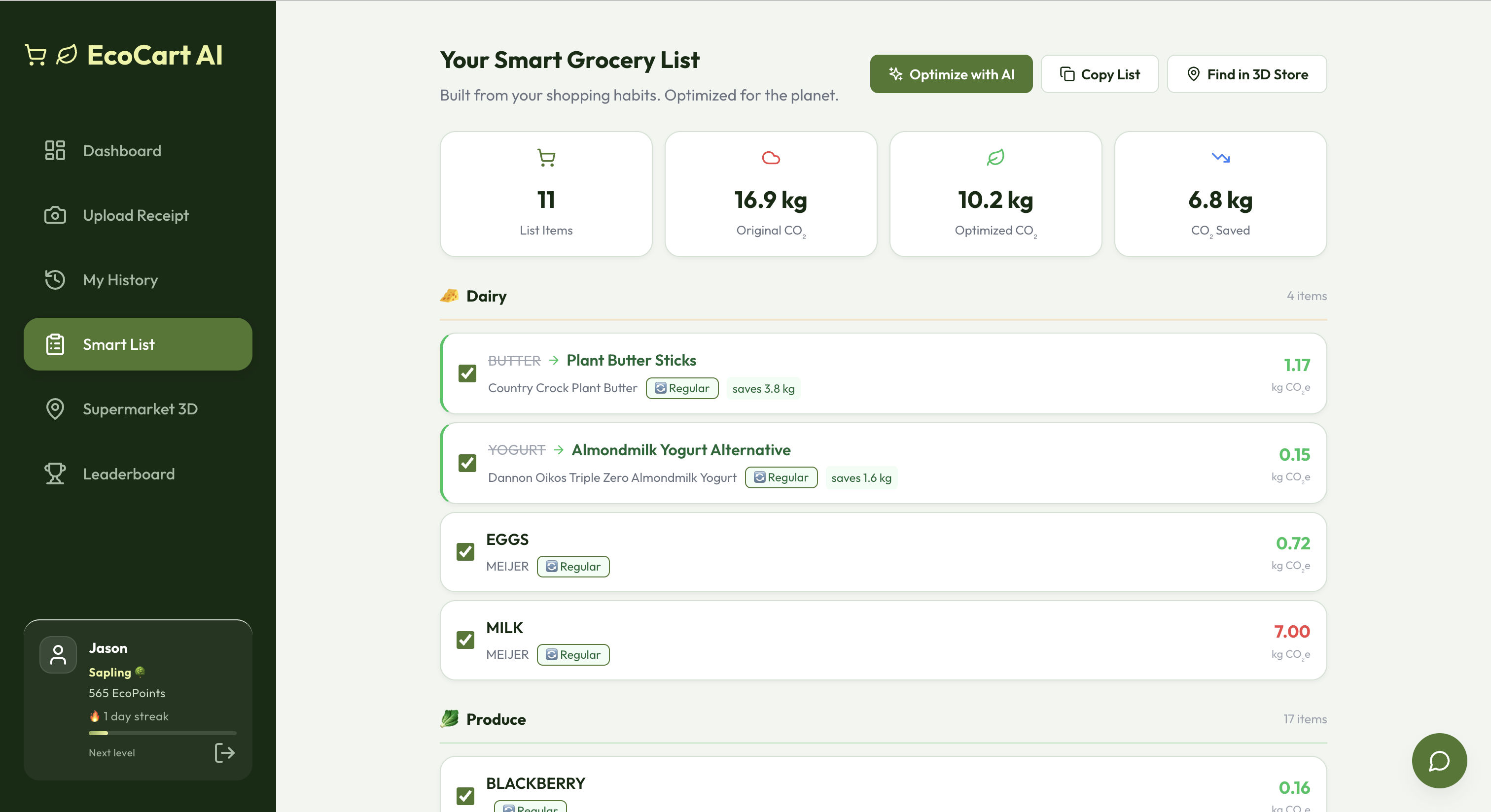 Smart Swap Recommendations For the highest-impact items on a receipt, EcoCart AI recommends realistic brand-for-brand alternatives, not "replace your steak with tofu." If you bought Tyson chicken breast, we'll suggest Perdue Harvestland Organic. If you bought Horizon milk, we'll suggest Organic Valley from a local cooperative. Every swap comes with a specific CO₂ savings estimate and a reason why it's better.
