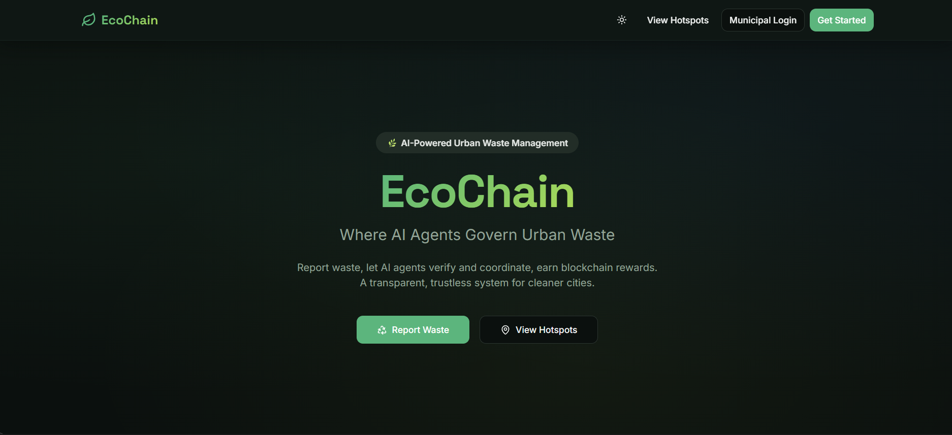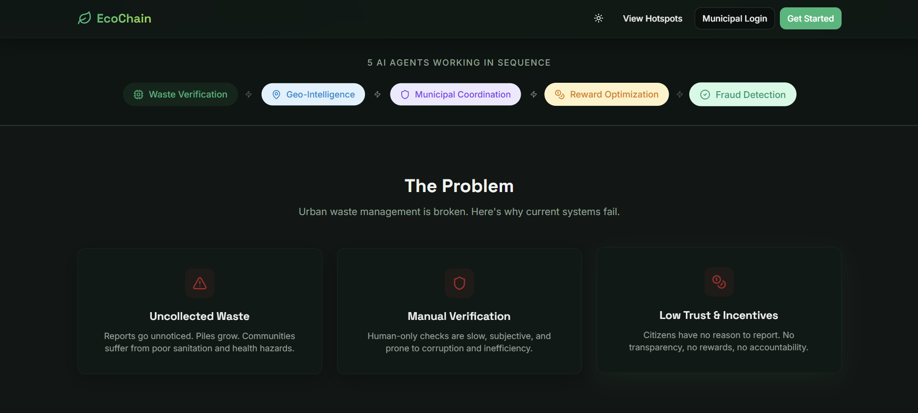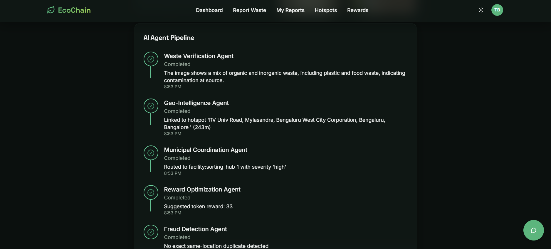 EcoChain is an AI‑powered urban waste intelligence system where citizens upload a photo and location, and a multi‑agent AI pipeline verifies whether it is real waste, classifies severity, and enriches it with geo‑intelligence.