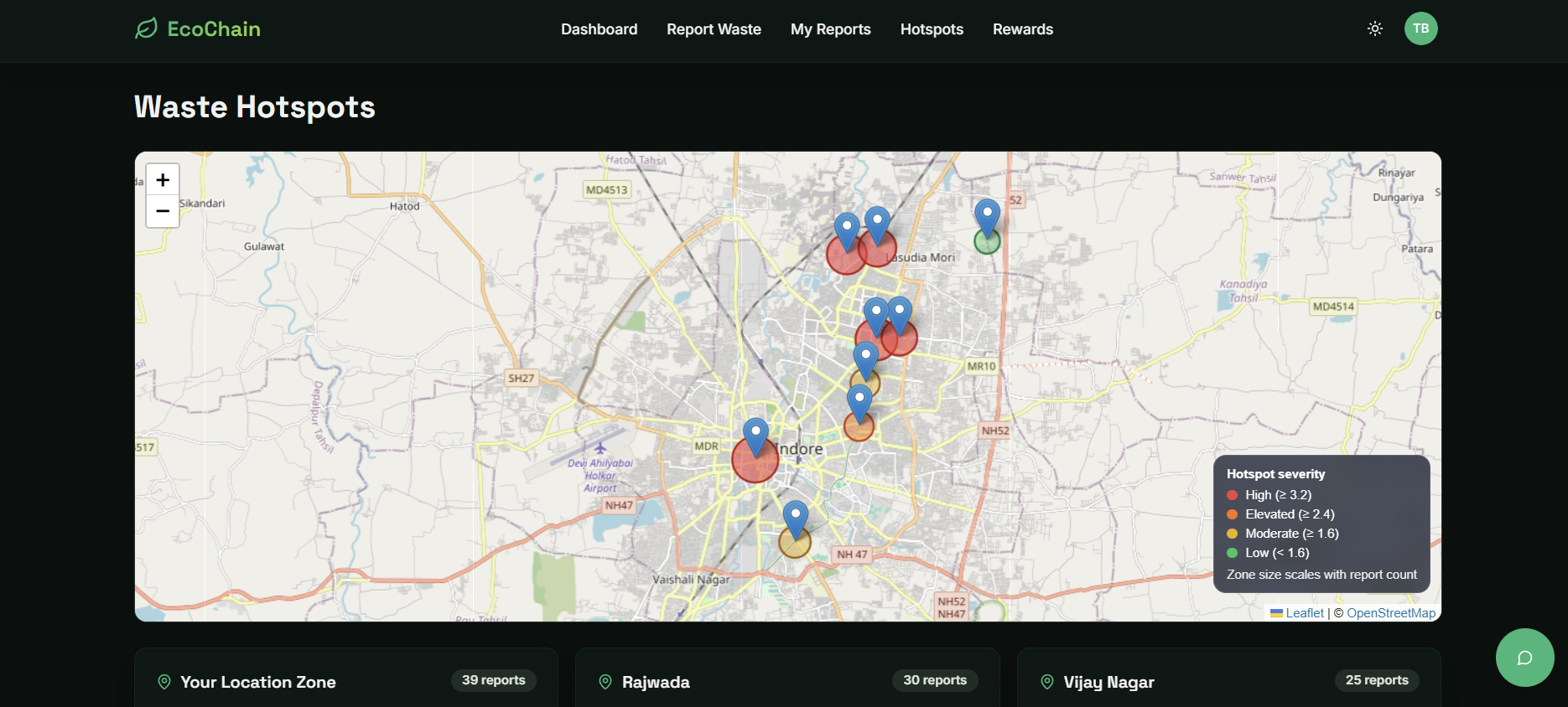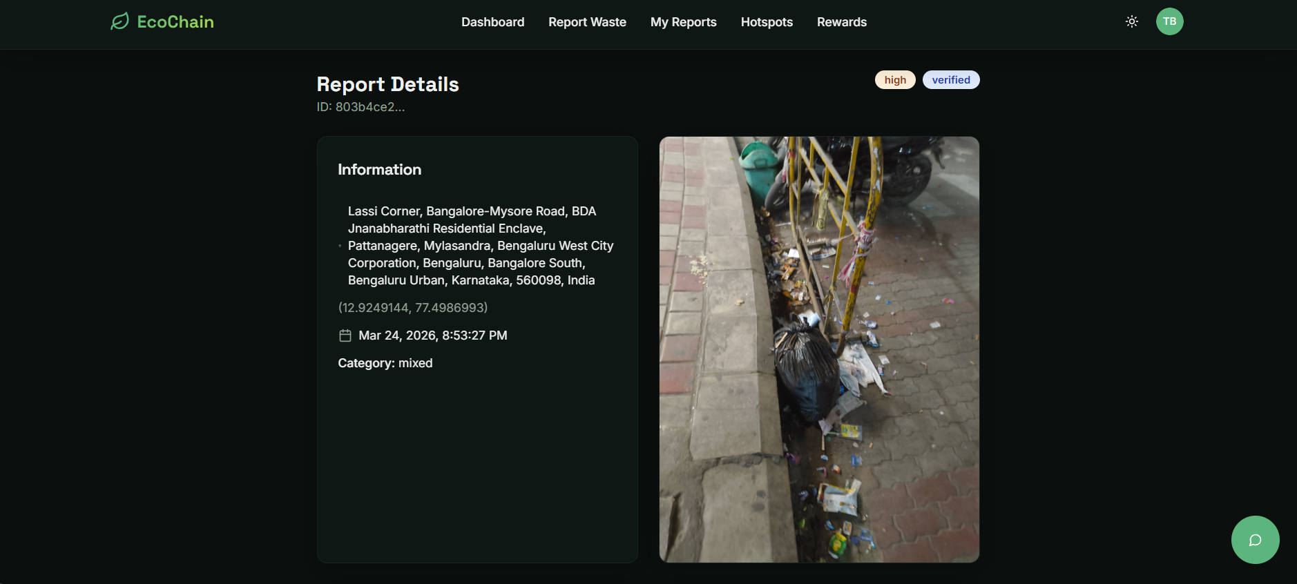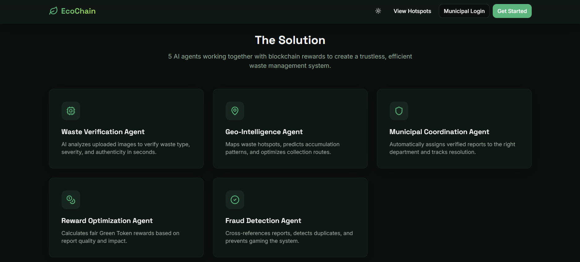 EcoChain is an AI‑powered urban waste intelligence system where citizens upload a photo and location, and a multi‑agent AI pipeline verifies whether it is real waste, classifies severity, and enriches it with geo‑intelligence.