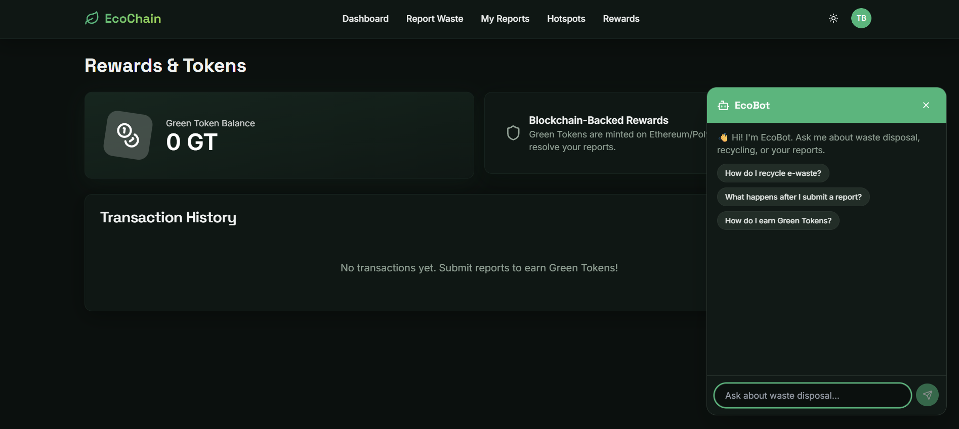 "Rewards & Tokens" interface showing a zero Green Token balance and a sample interaction with EcoBot.