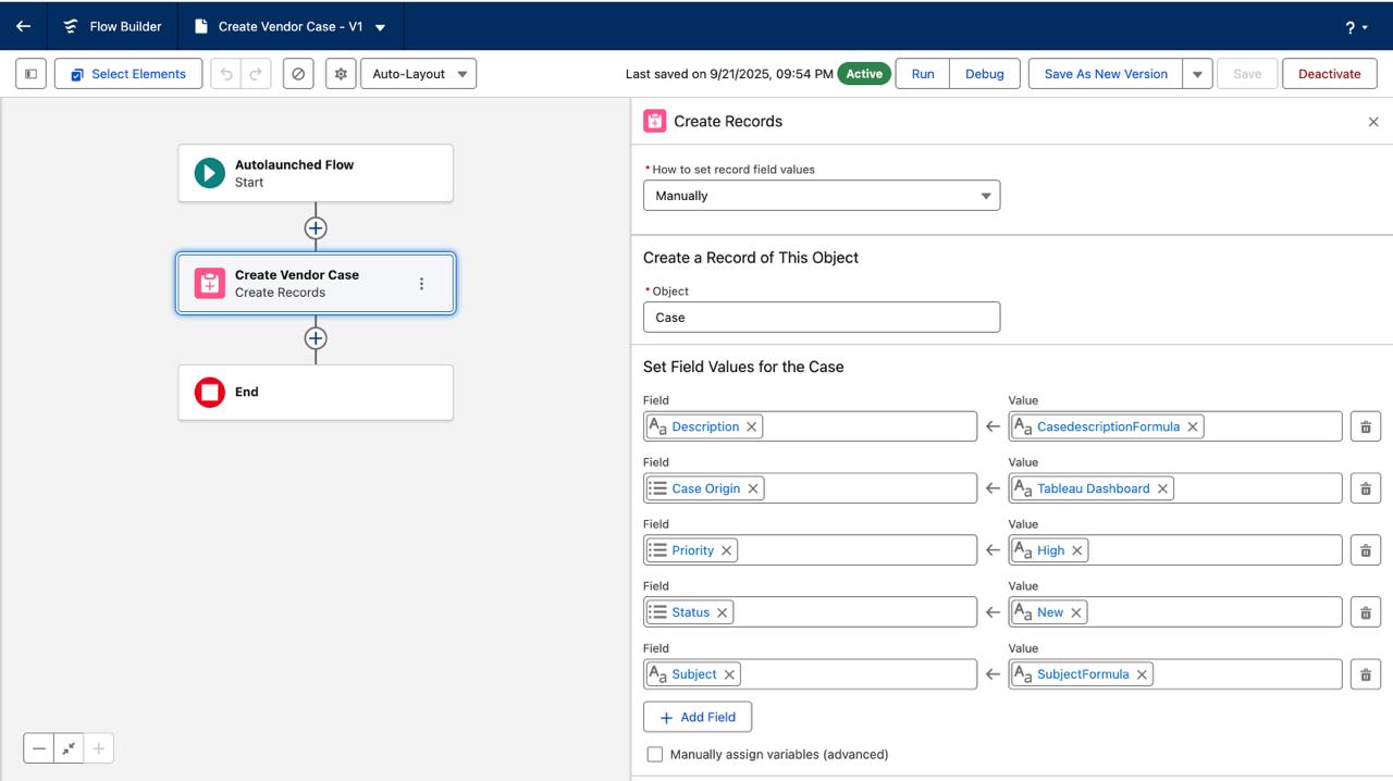 - Built a Custom Flow → “Create Vendor Case”