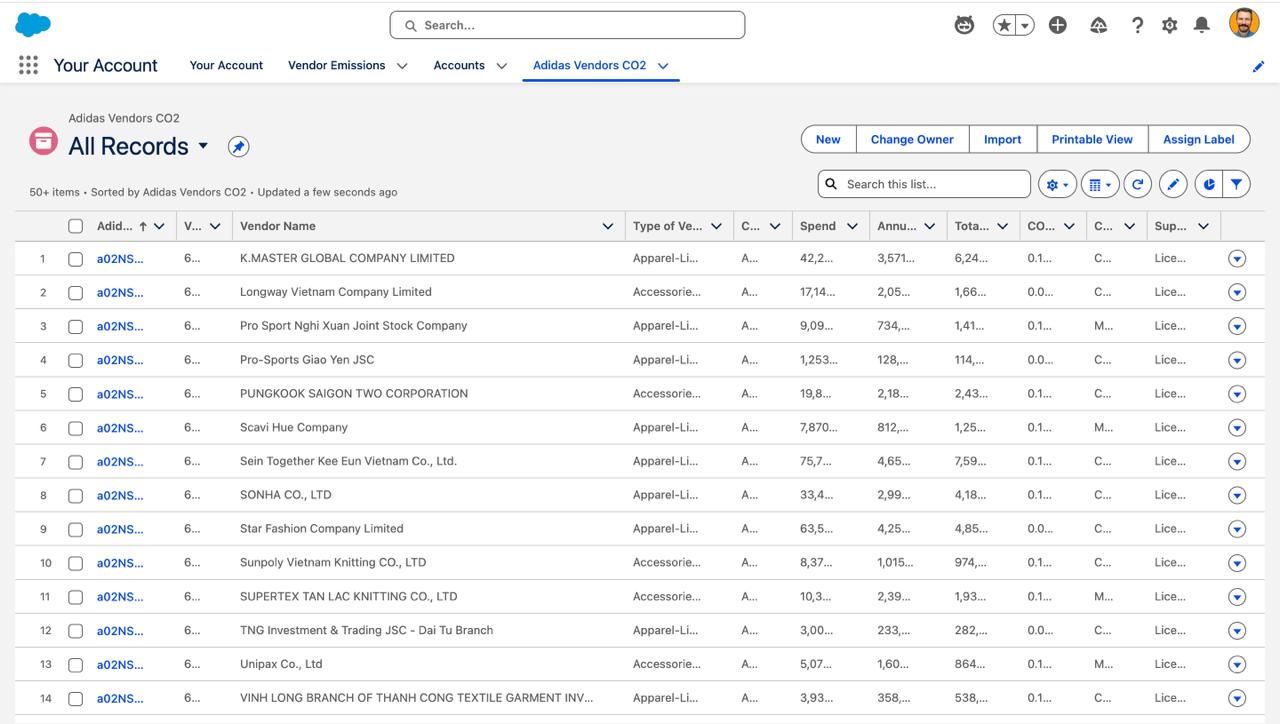 We built our solution as a prototype vendor sustainability solution for Adidas, inspired by their publicly disclosed global supplier list. Adidas, like many fashion brands, faces intense pressure to address Scope 3 emissions across its complex supply chain. We imported Adidas’ supplier names, locations, and other details into Salesforce, then fabricated realistic sustainability fields like spend, CO₂ intensity, compliance flags, etc. to model how a brand like them could track and act on vendor emissions in real time. EcoChain gives businesses a 360° view of vendors.