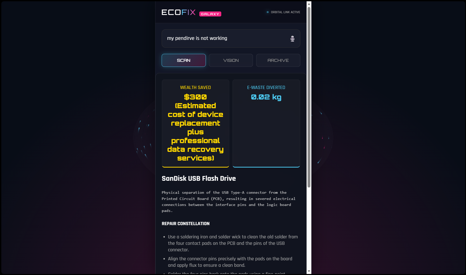 The Visuals: The dynamic Galaxy theme with the rotating accretion disk animation makes the app feel futuristic and engaging. The Speed: Leveraging Gemini 3 Flash allows the "Live Capture" feature to return a diagnosis in seconds, making the experience feel truly real-time. The Logic: Successfully calculating "E-Waste Diverted" adds a tangible layer of purpose to the application.