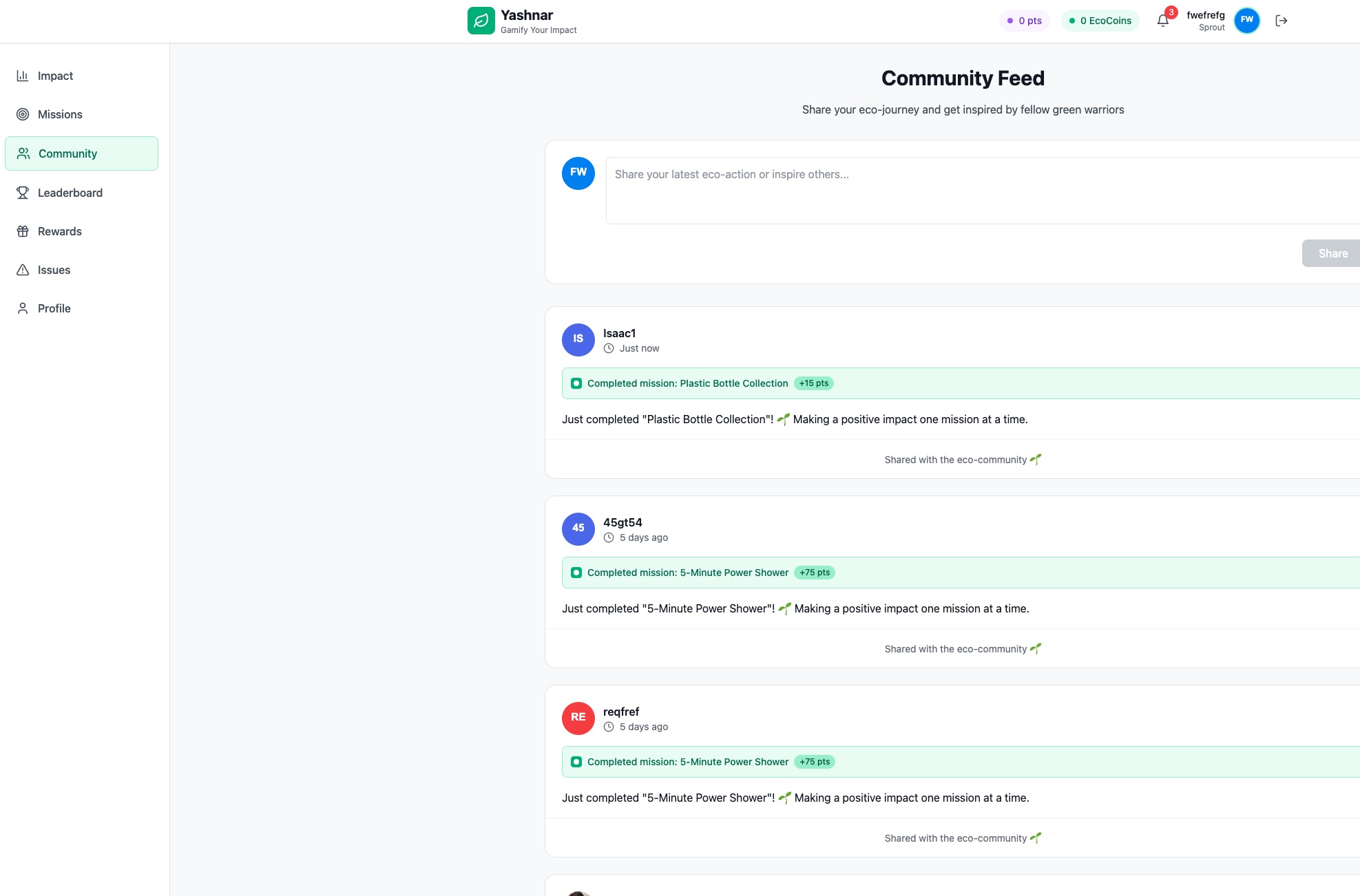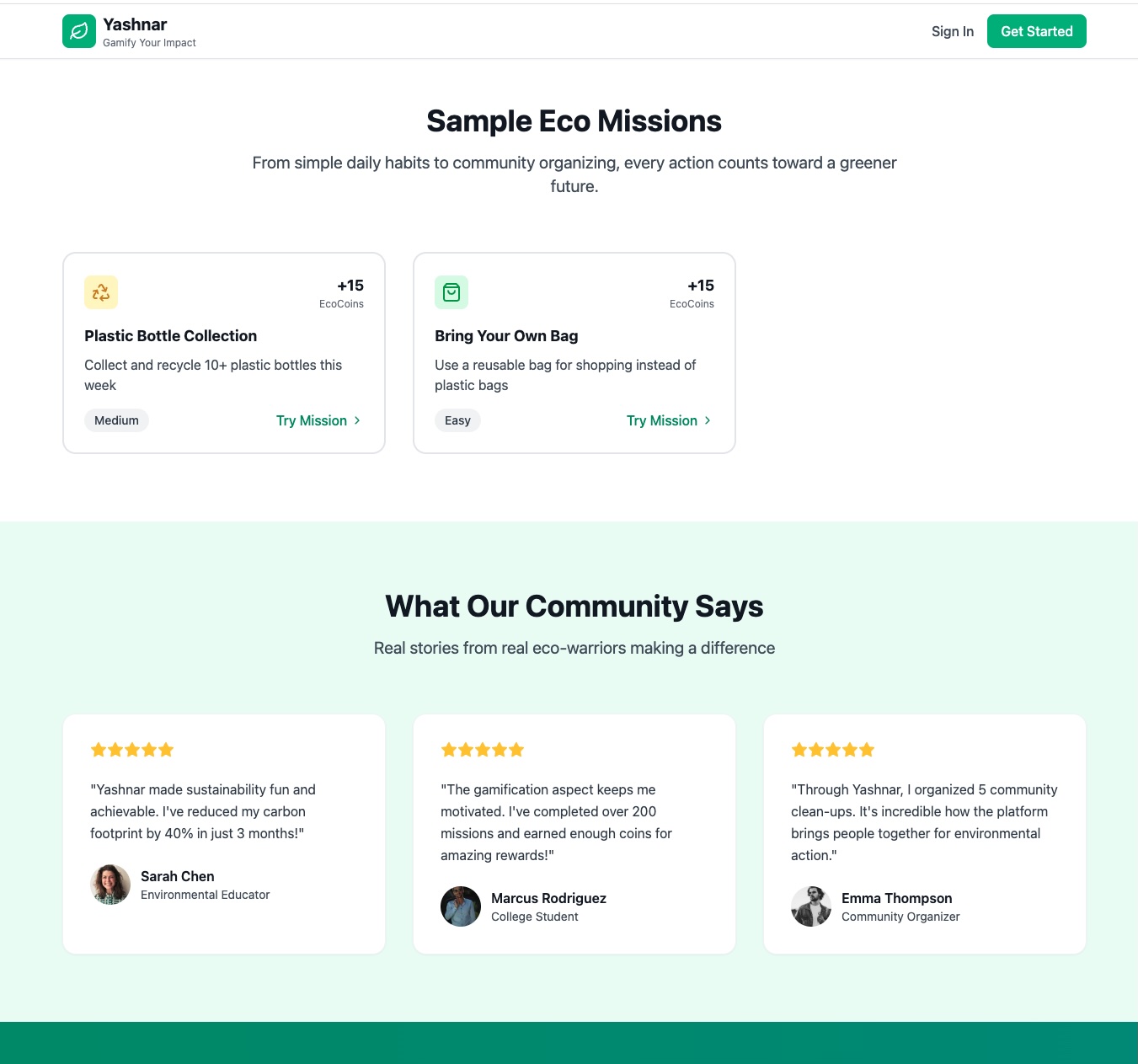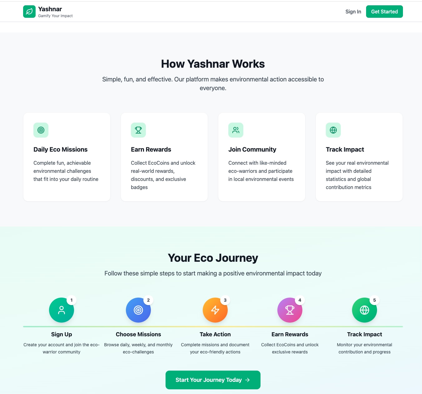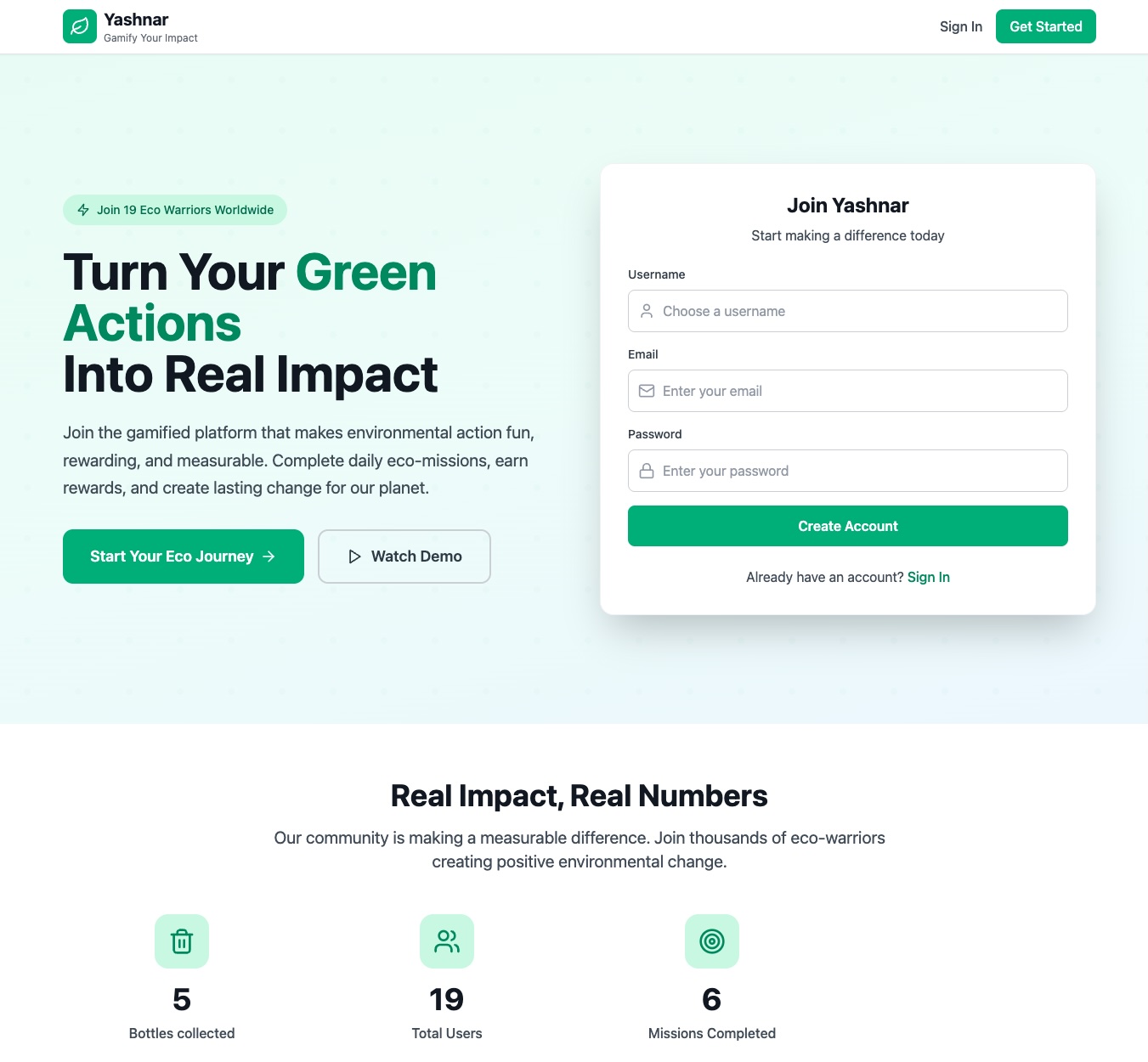 Yashnar is an MVP-stage EcoGame where users complete real-world environmental challenges — such as recycling, reducing waste, or planting trees — and earn points, badges, and rewards.