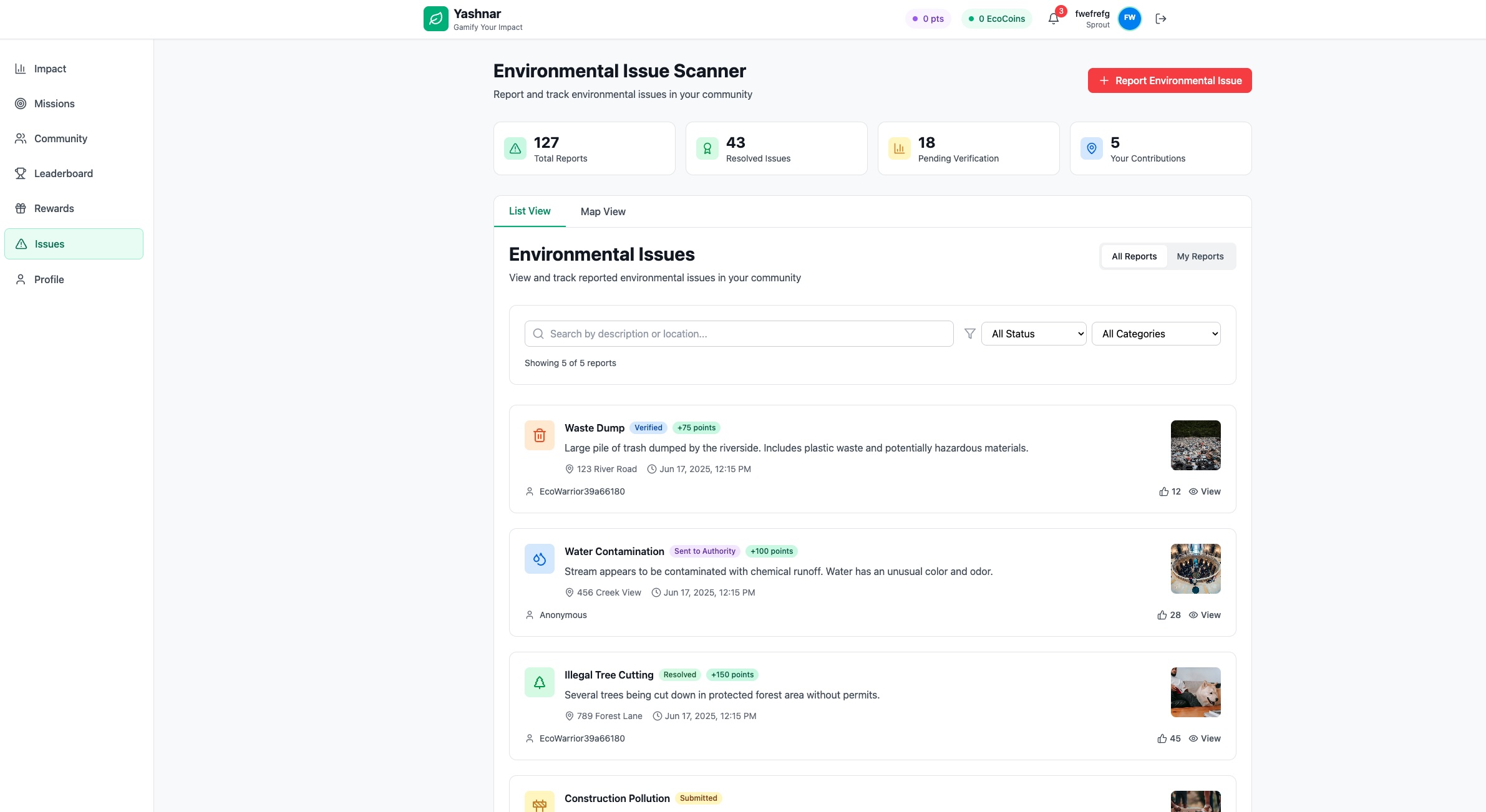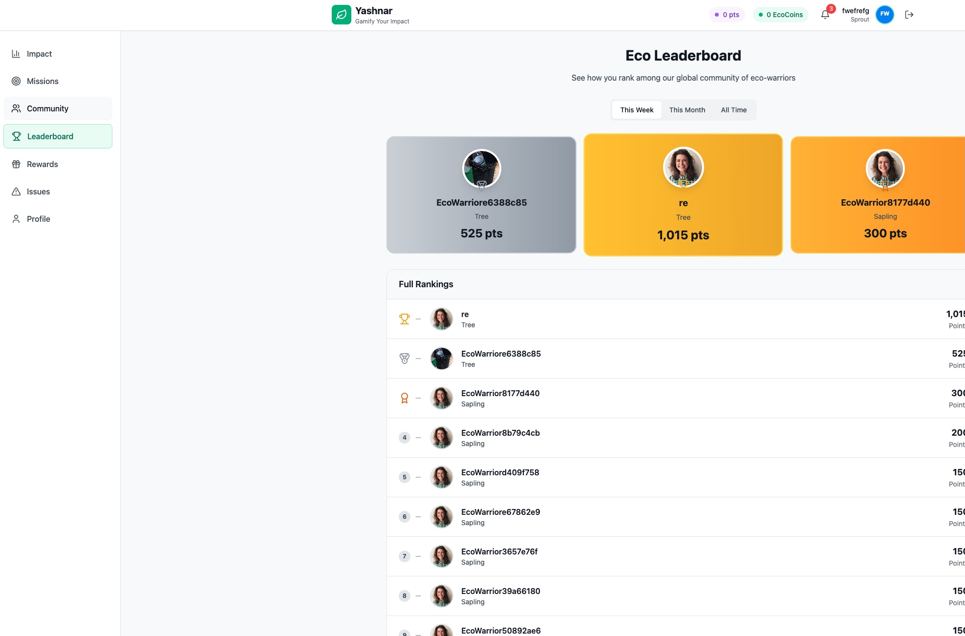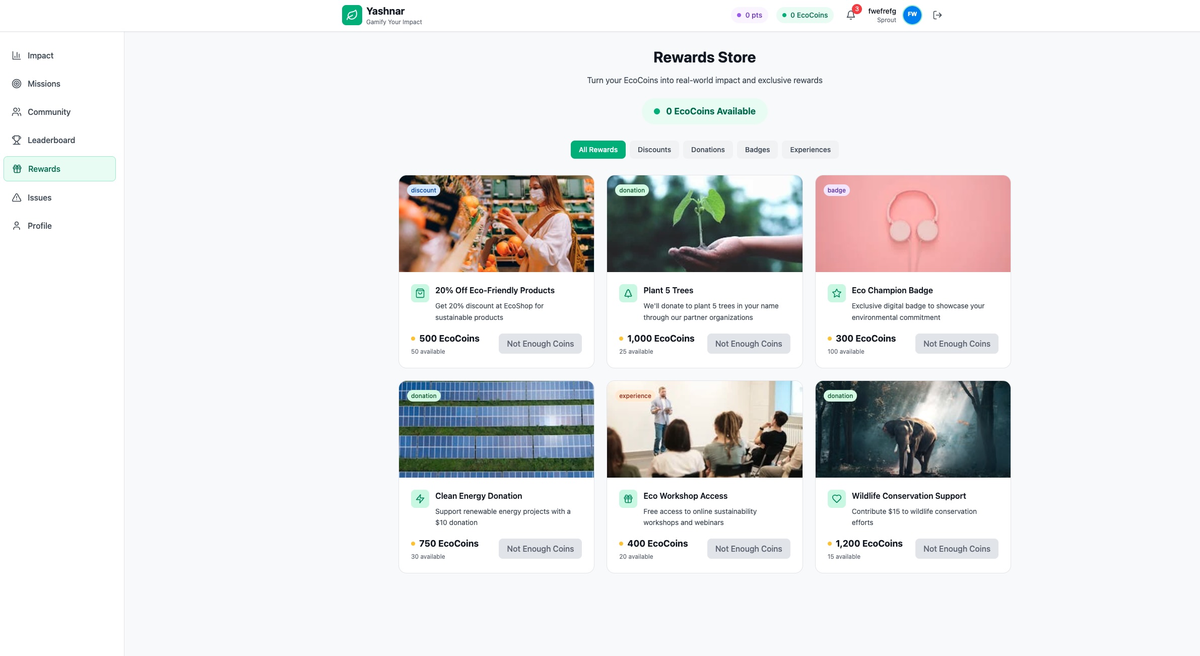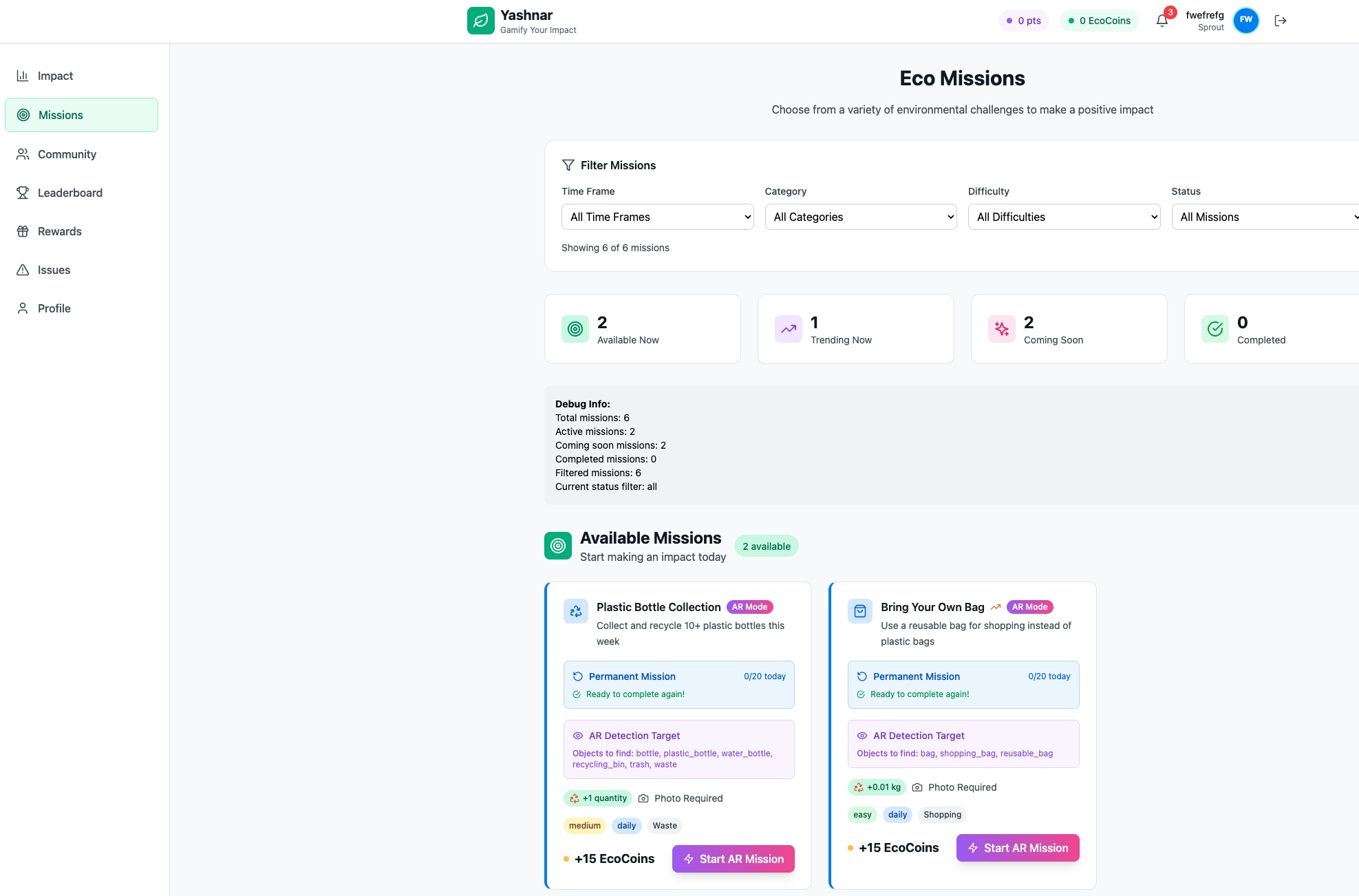Yashnar is an MVP-stage EcoGame where users complete real-world environmental challenges — such as recycling, reducing waste, or planting trees — and earn points, badges, and rewards.