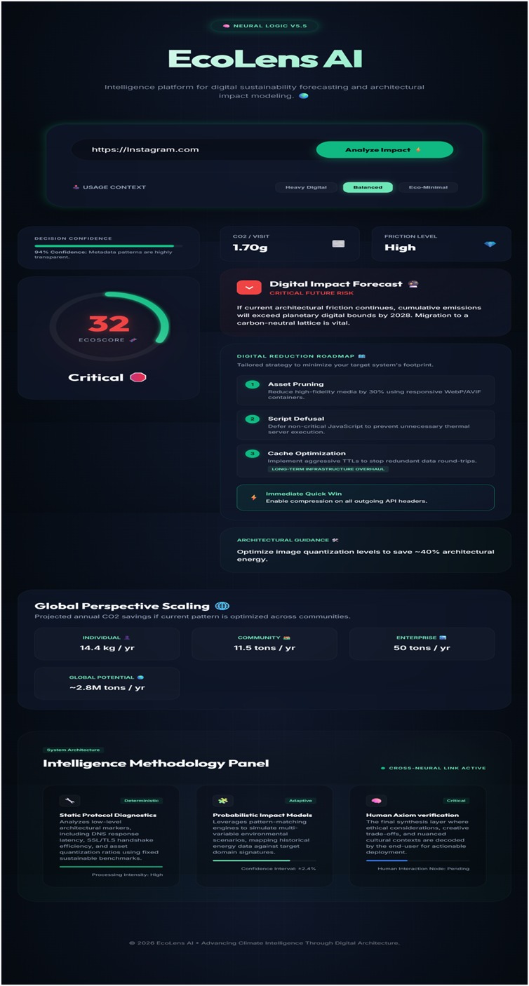 As digital usage continues to increase, the environmental impact of online activity often goes unnoticed. While sustainability conversations usually focus on physical resources, the energy and emissions associated with digital platforms are rarely visible. This inspired the idea behind EcoLens AI: to make digital sustainability understandable and actionable for everyday users.
