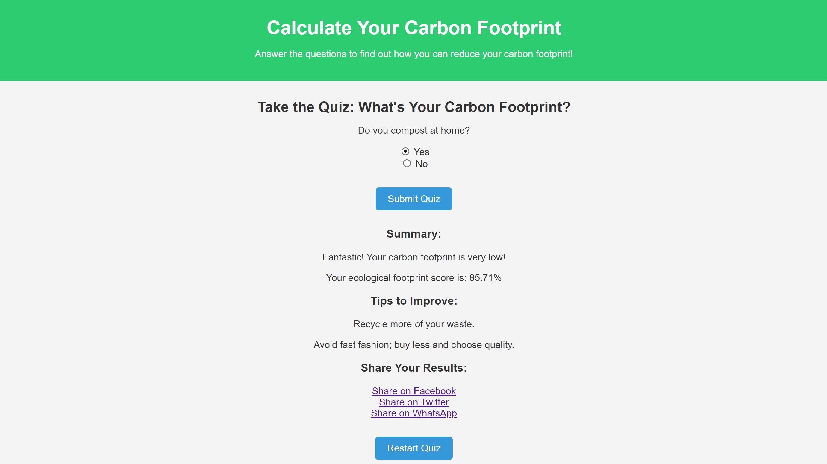 We used all HTML, CSS, and JS to build a fun and easy-to-use quiz. The quiz asks users questions about their daily habits and calculates their carbon footprint based on their answers. At the end, users get personalized tips on how to reduce their impact on the environment. We also included social sharing features, so users can share their results on Twitter and Facebook to spread awareness.