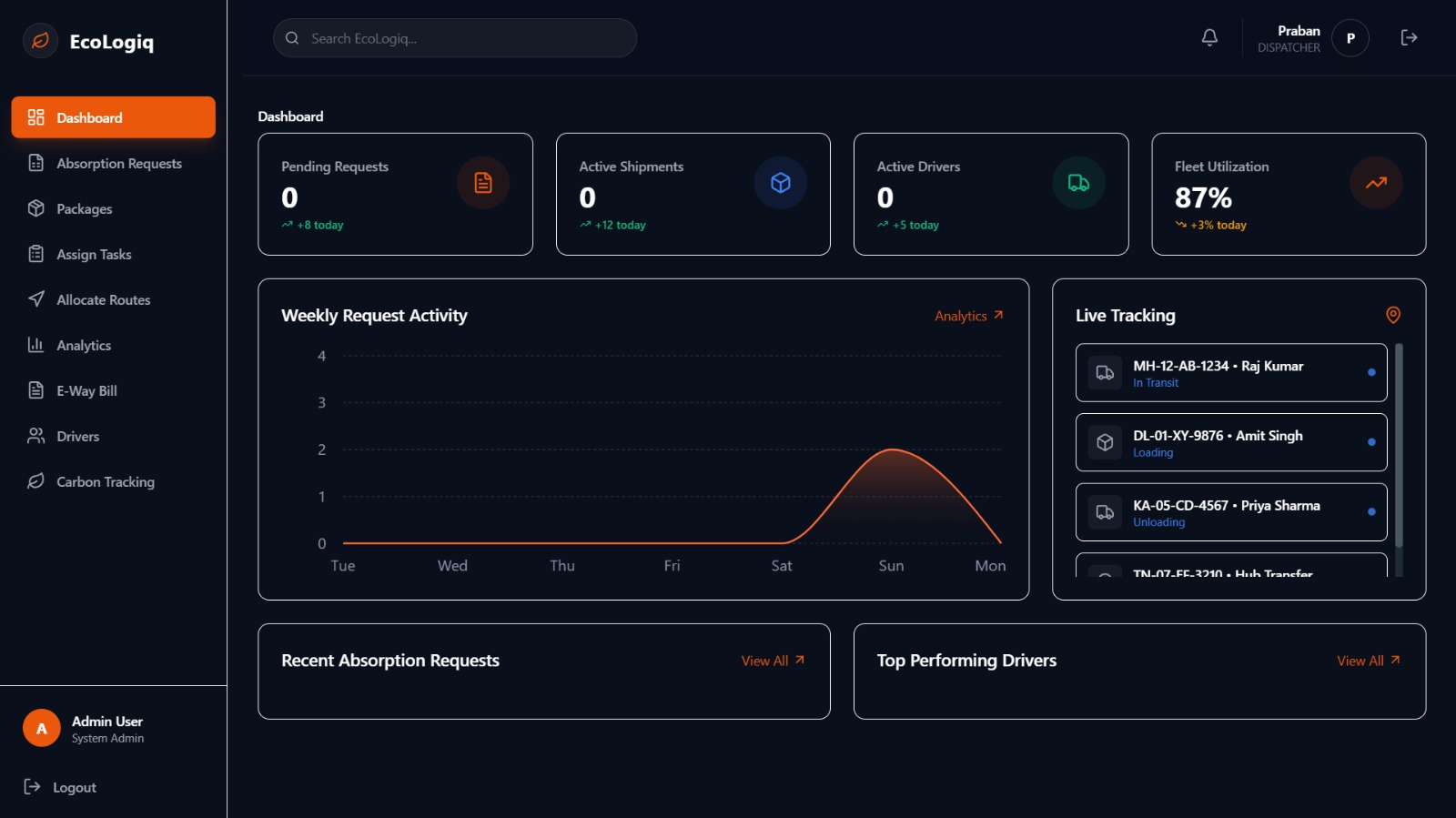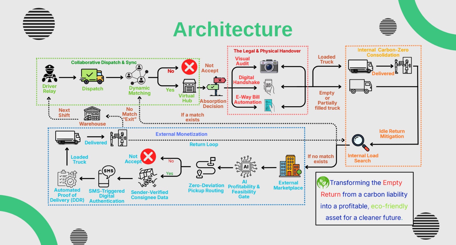 EcoLogiq is an AI-powered, full-stack logistics platform which eliminates India’s chronic 40% empty return miles (as confirmed in the 2025 DPIIT-NCAER Logistics Cost Assessment) by enabling real-time cargo absorption between trucks — with secure mid-transit handovers, automated E-Way Bill 2.0 updates, and zero extra kilometers driven.