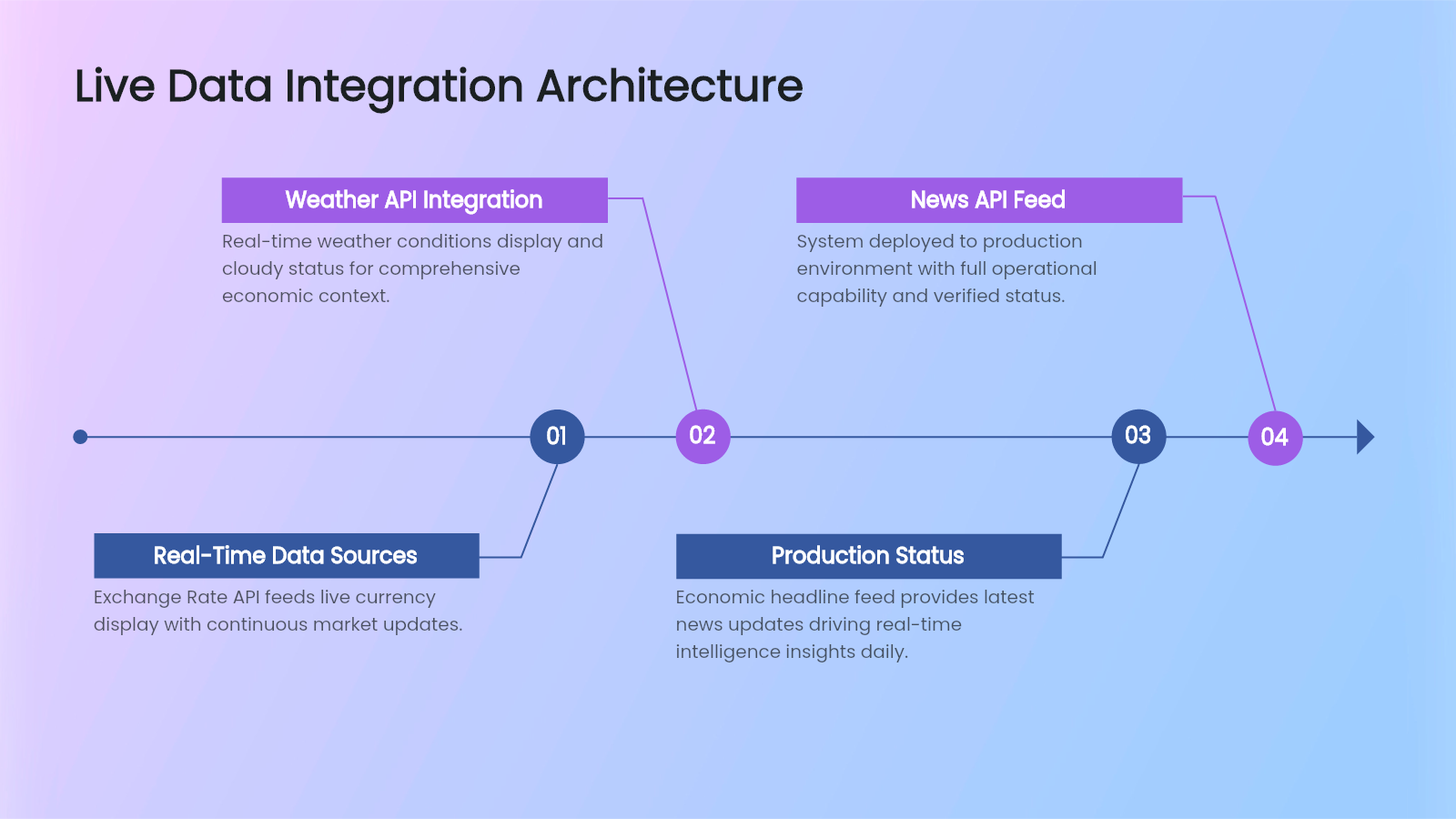 - Live data comes from ExchangeRate-API, Open-Meteo, and NewsAPI