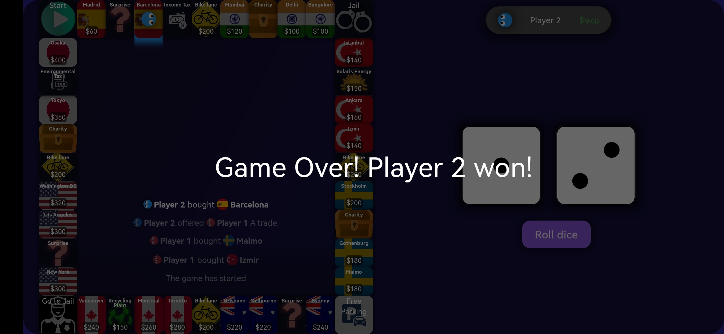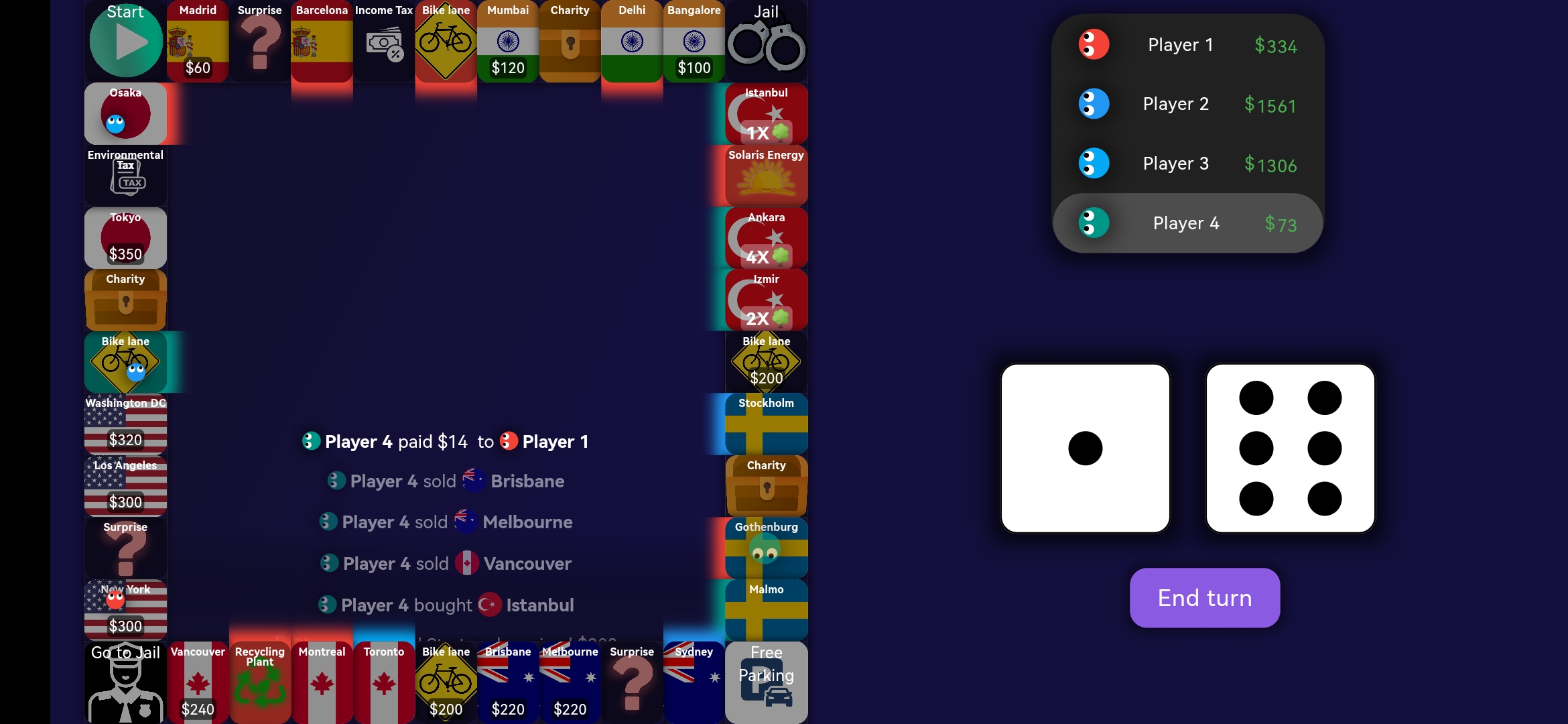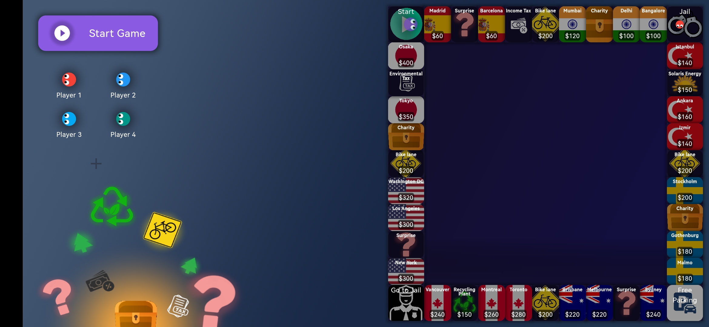 it is a pass-and-play mobile game where you compete against your friends to buy cities and plant trees, landing on a city with many trees will cost you! Buy sustainable energy companies and bike lanes, If you land on a tax card you have to pay an Environmental Tax! Trade properties with your friends and build your Own Green Empire!