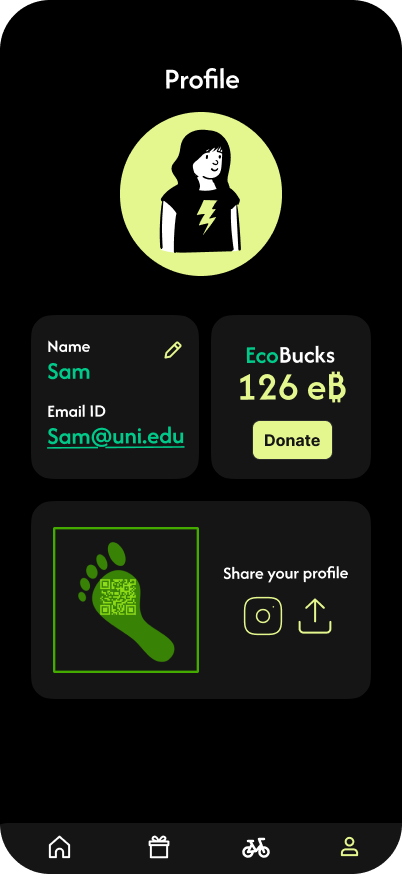 - The student can choose to alternatively donate their EcoBucks to fund campus sustainability initiatives, such as planting trees or installing solar panels, by clicking the “Donate” button.