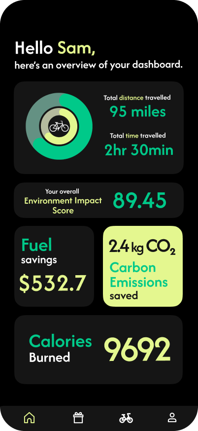 - After logging in, users are taken to the Home Dashboard, which serves as a personalized summary of their eco-friendly transportation activity.