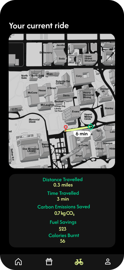 - Once the ride begins, the app dynamically tracks metrics like speed, distance, fuel savings, calories burned, and estimated carbon savings in real-time.