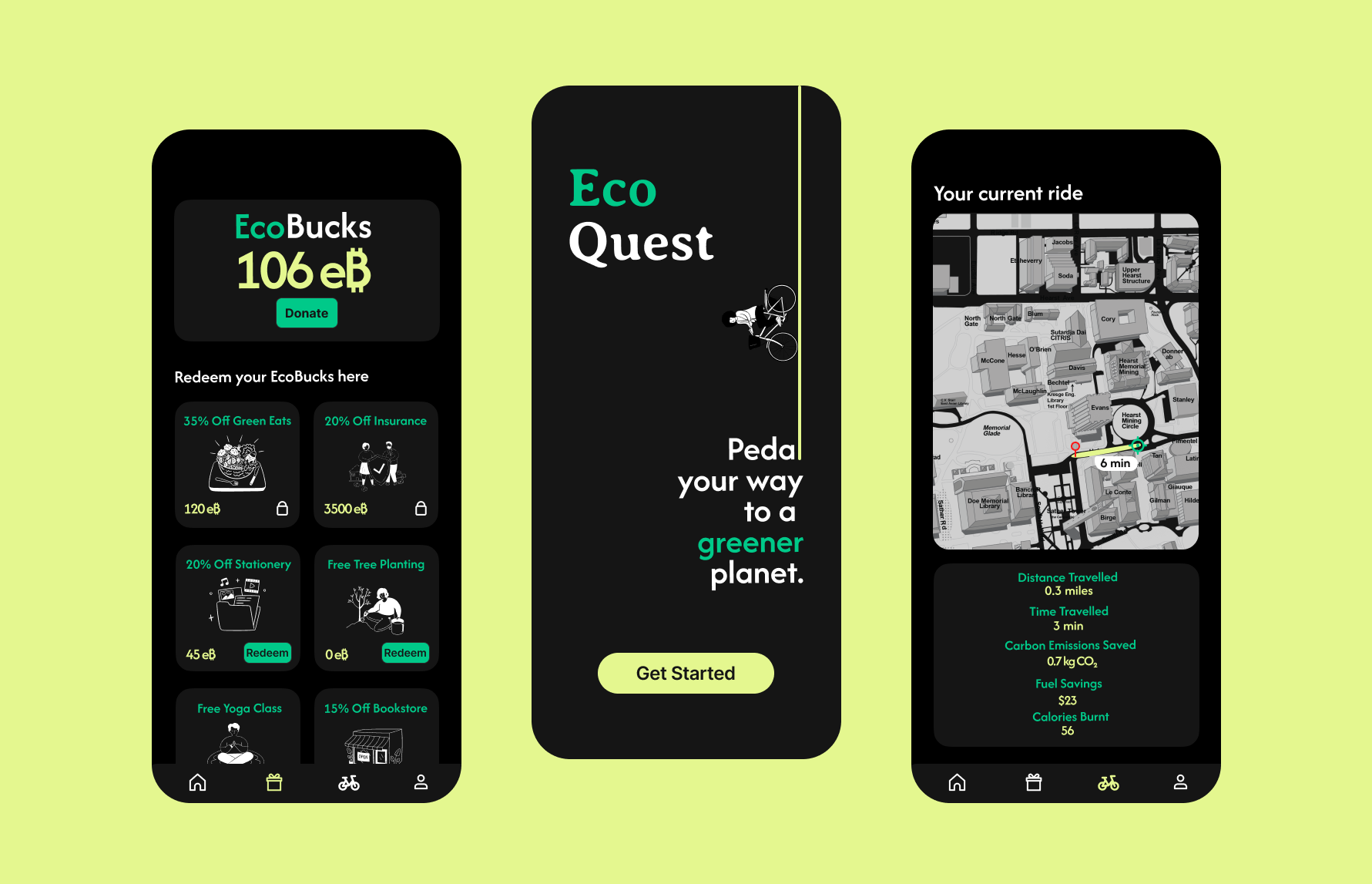 EcoQuest is a mobile app designed to encourage university students to adopt biking over driving to reduce carbon emissions and promote sustainable transportation on campus. Here's how the app functions overall: