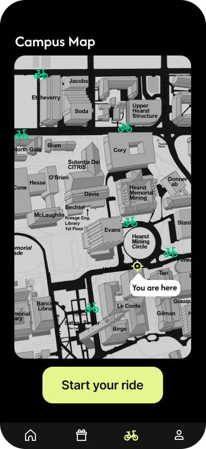 - Campus Map: Users can see a real-time map of the campus, including bike pick-up spots (marked with green bike icons).