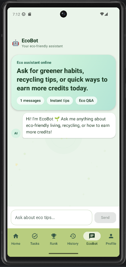 EcoBot is an AI assistant that provides instant eco tips, sustainability guidance, and in-app help for users.