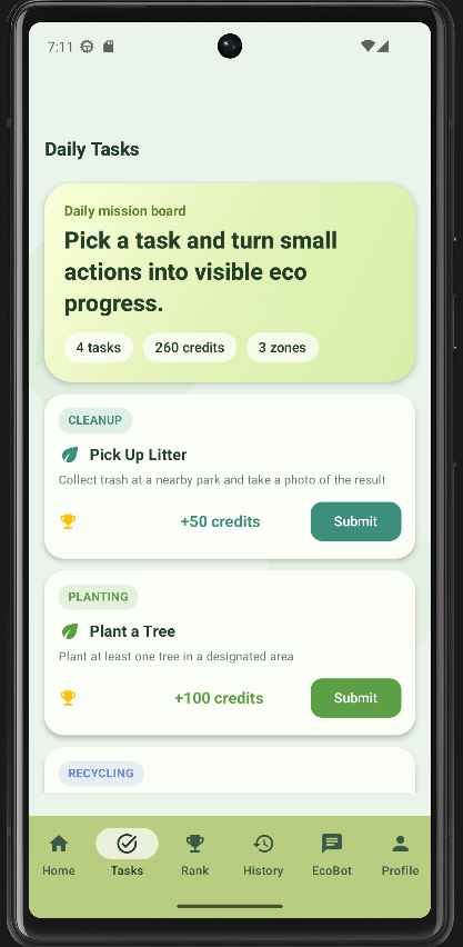 Tasks screen lists daily eco missions with rewards, helping users pick and complete real-world environmental actions.