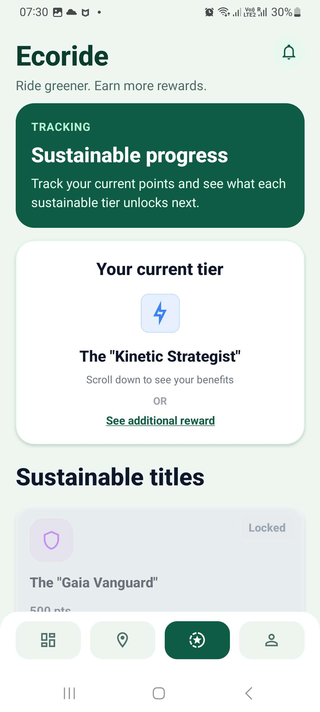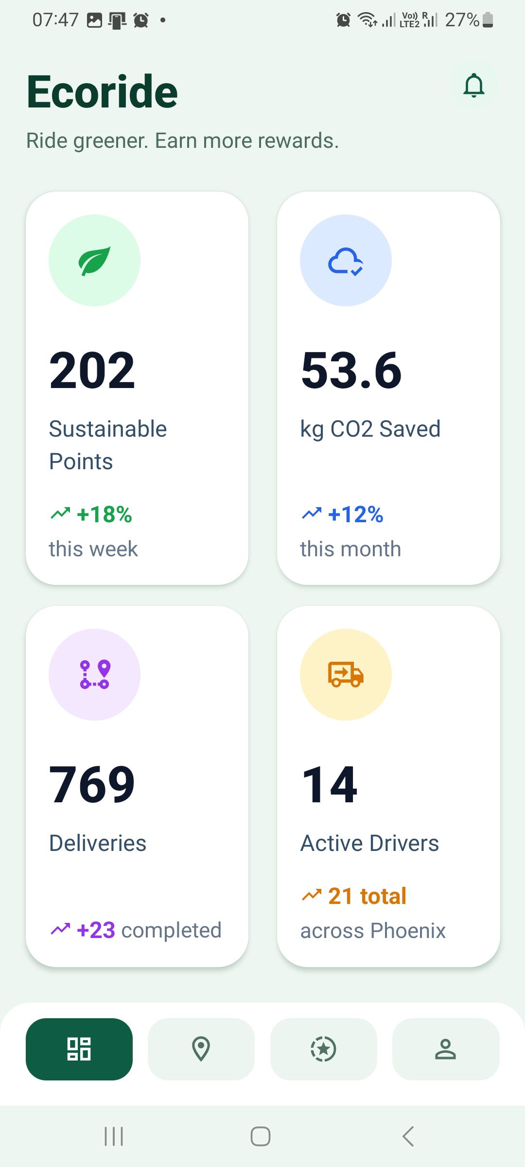 The app also tracks sustainability impact through metrics like CO2 saved, total deliveries, and active drivers. On top of that, EcoRide includes gamified features such as milestones, honor tiers, reward vouchers, trip history, and point history so users can see both their environmental impact and their personal progress.