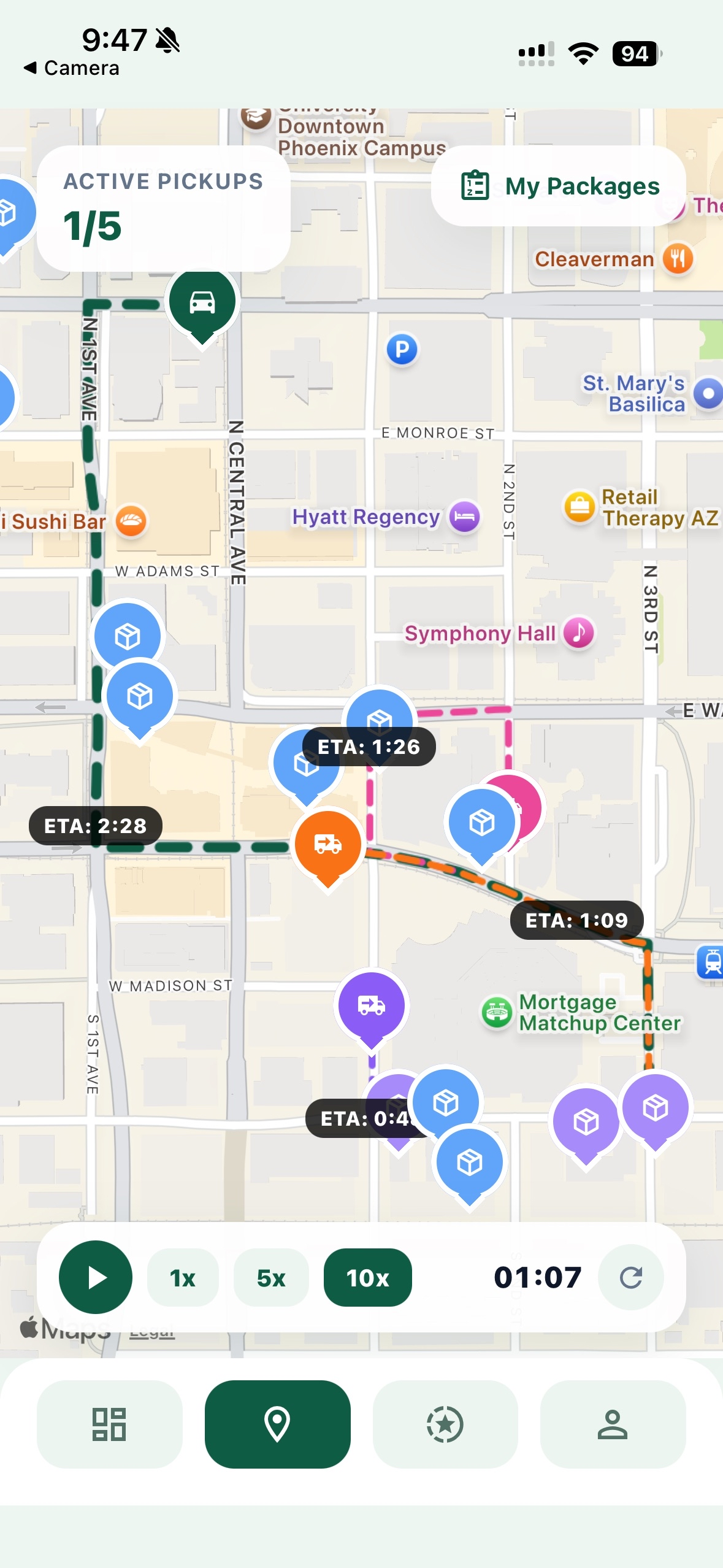 Under the hood, we created a custom simulation engine to power package spawning, driver behavior, route progression, and conflict detection. We used react-native-maps to visualize drivers, packages, route polylines, ETAs, and delivery targets in real time. For routing, we integrated OpenStreetMap Valhalla data and added a fallback route system so the simulation still works even if live route fetching fails. We also built helper modules for geometry, drivers, packages, and routing logic to keep the app organized.