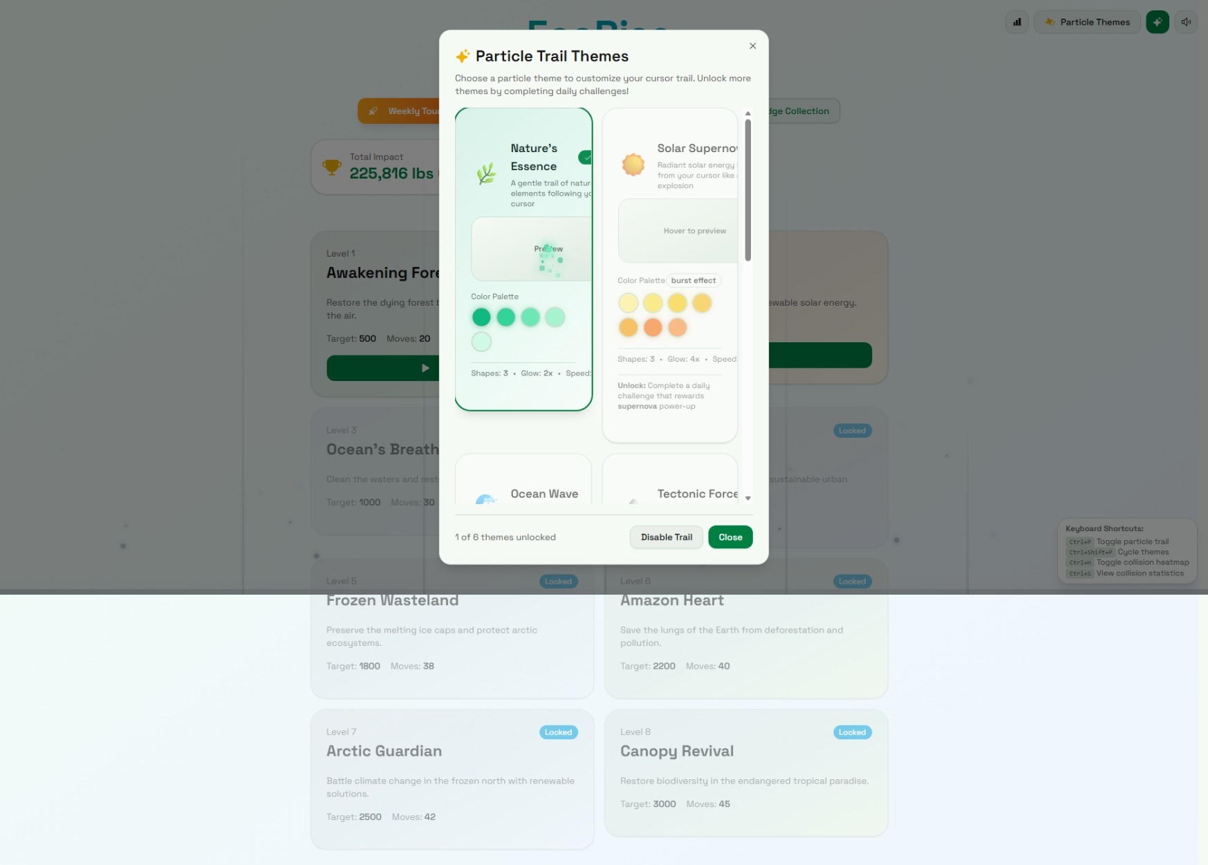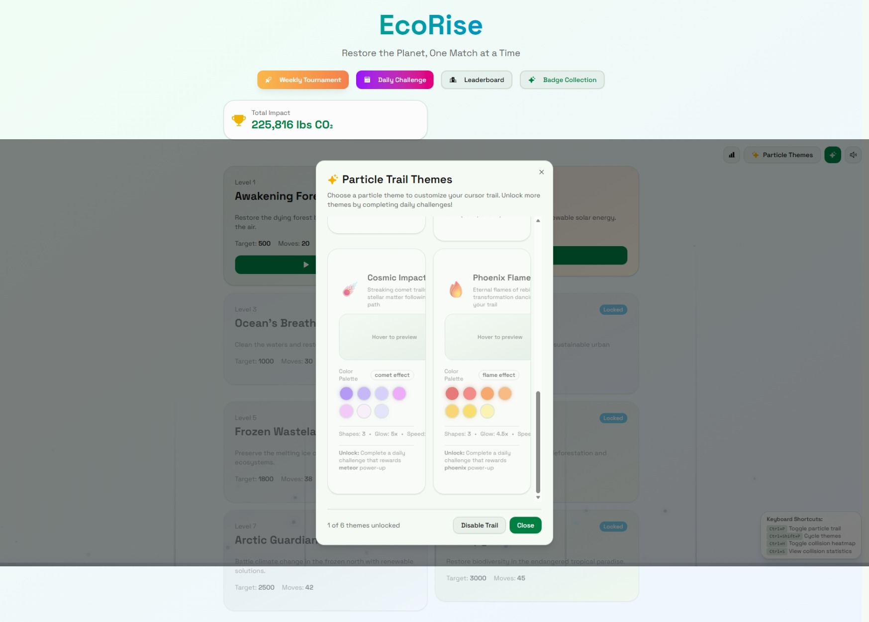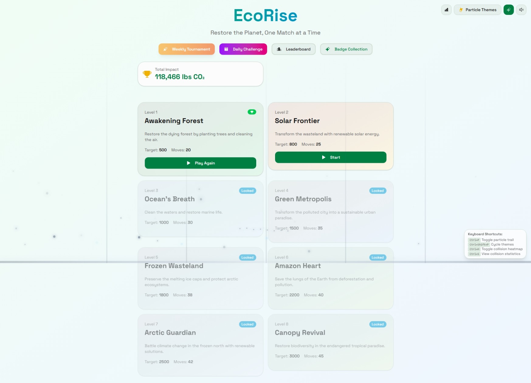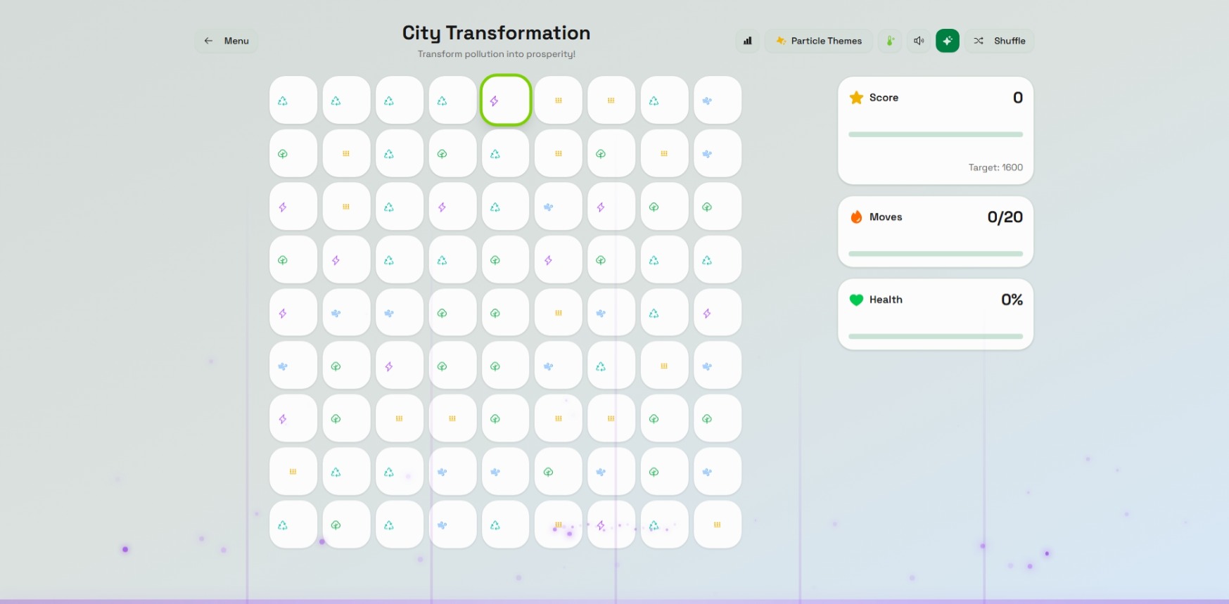 EcoRise transforms climate education into an addictive puzzle-adventure. Players match tiles representing real environmental solutionsโsolar panels, wind turbines, trees, and recyclingโto clean pollution and restore six unique biomes: forests, deserts, oceans, cities, tundras, and rainforests.