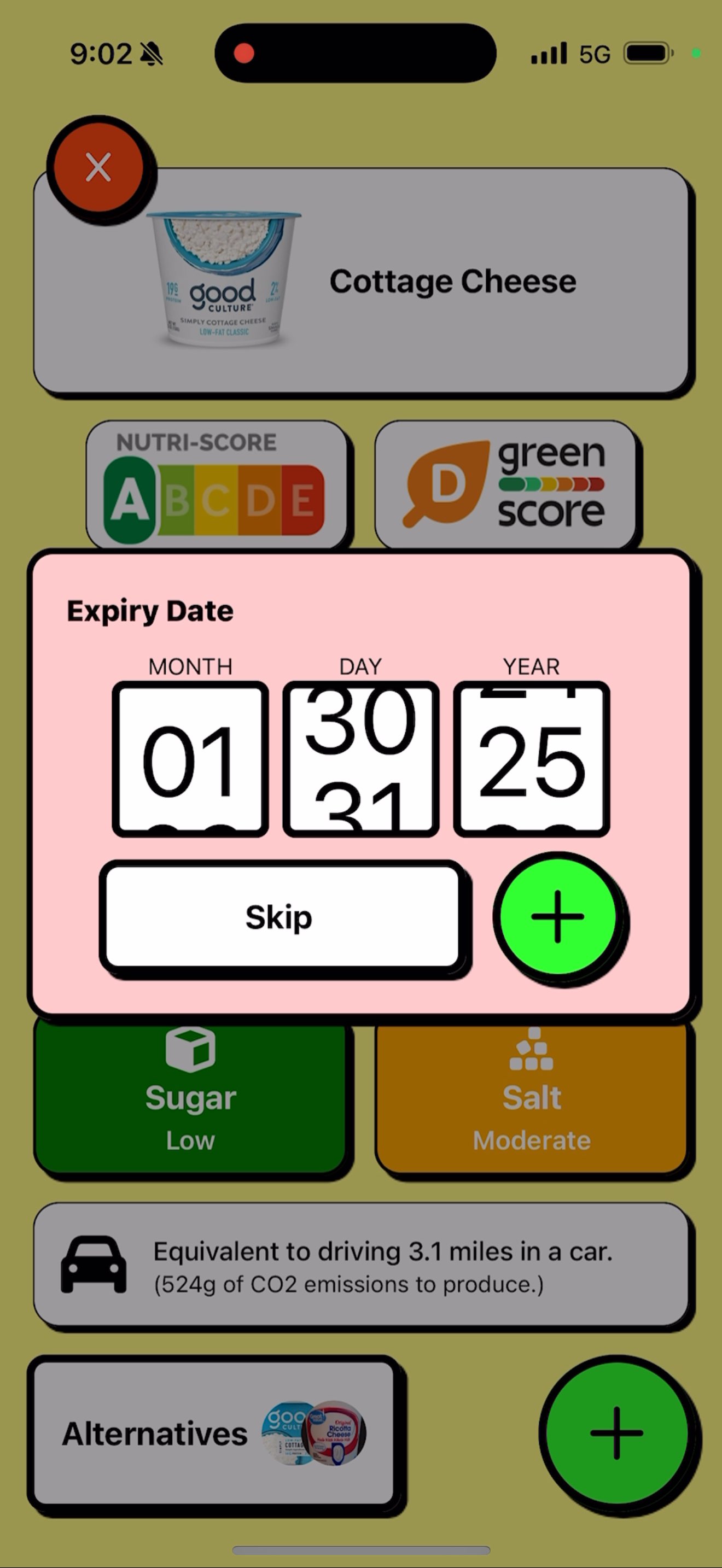 Our app scans barcodes and retrieves a food’s “green score,” which indicates its sustainability, fat, sugar, and salt content, its “nutri-score,” which shows how healthy food is overall, and the CO2 produced by the product’s manufacture. To encourage people to explore more environmentally-conscious alternatives, the app uses AI to suggest similar products with a better “green score.”