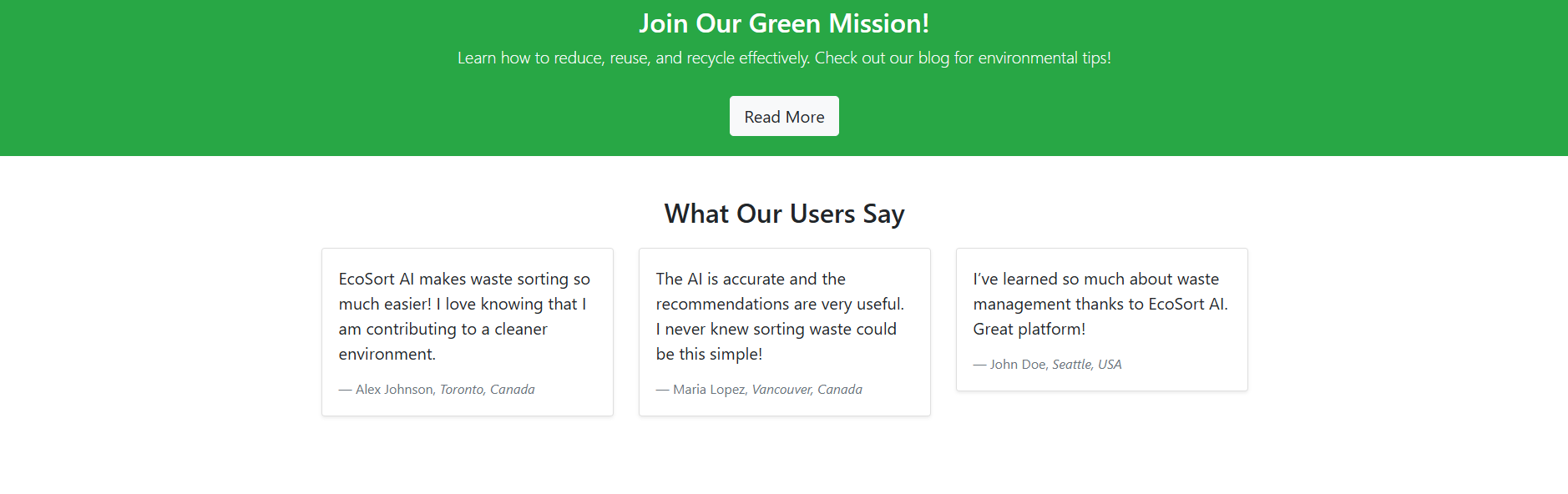 Localization and Geolocation: We plan to add features that provide users with nearby recycling centers based on their location, making the solution more practical and actionable. Gamification: To encourage engagement, we aim to introduce a points-based system where users earn rewards for correctly sorting waste, promoting environmentally responsible behavior. Crowdsourced Data Collection: We want to expand our dataset by crowdsourcing images from users, which will help the AI model become more accurate over time and adapt to different types of waste items globally.