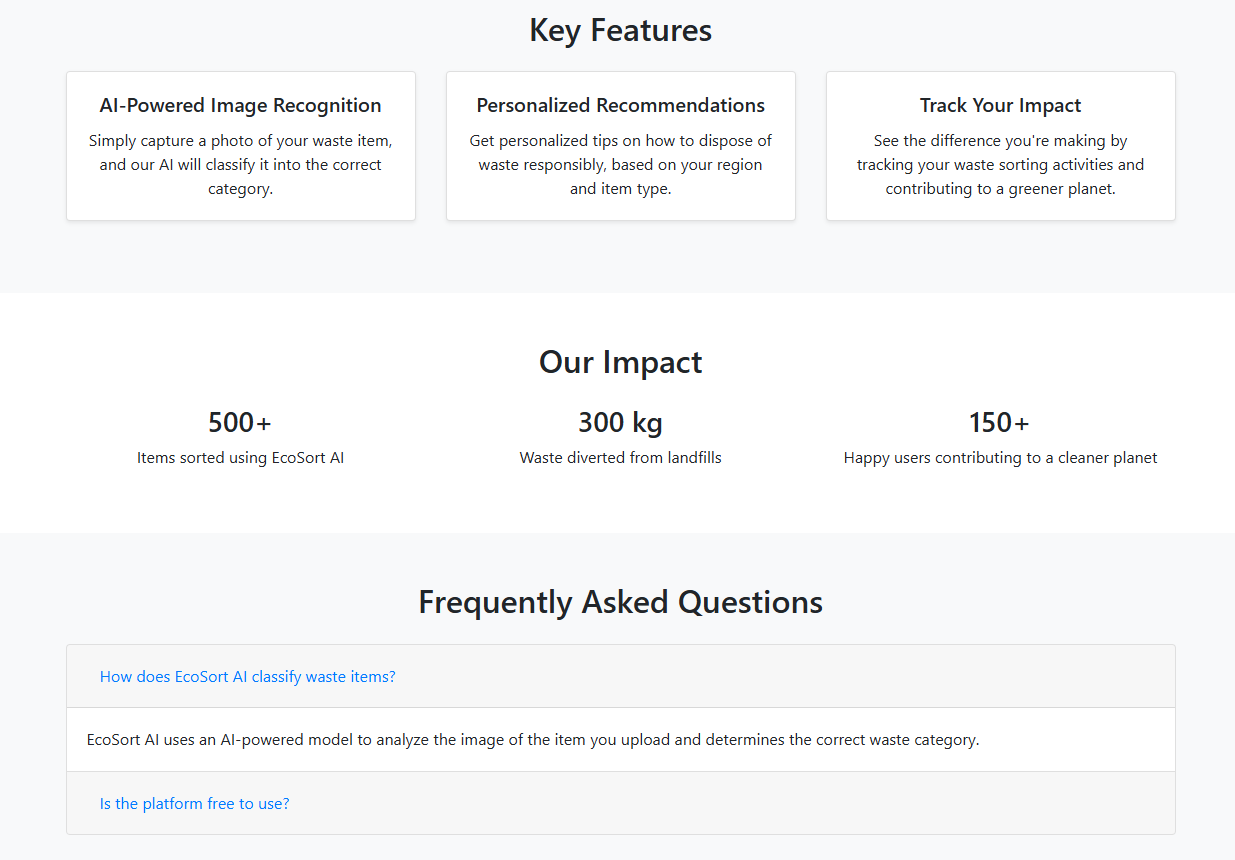 Collaboration is Key: Building EcoSort AI taught us the importance of teamwork and interdisciplinary skills, combining AI, web development, and cloud infrastructure. Data Augmentation and Optimization: We gained deeper insights into how data augmentation and transfer learning can overcome data limitations, leading to better model performance. Balancing Complexity and Usability: We learned how to simplify a complex AI-driven solution to make it user-friendly and accessible for a general audience, which is crucial for ensuring high adoption rates.