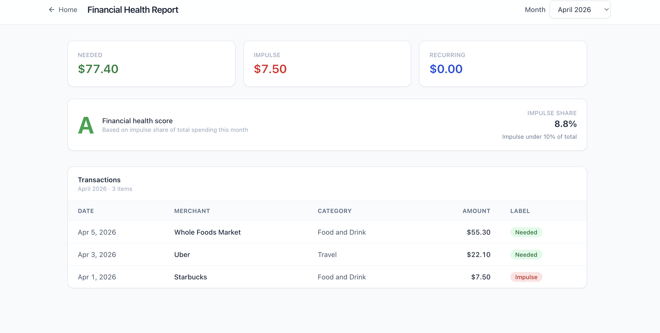 - Financial Health Report (/statements): month view with Needed / Impulse / Recurring splits, a health grade from impulse share, and a labeled transaction table (mock data + heuristics for the hackathon).