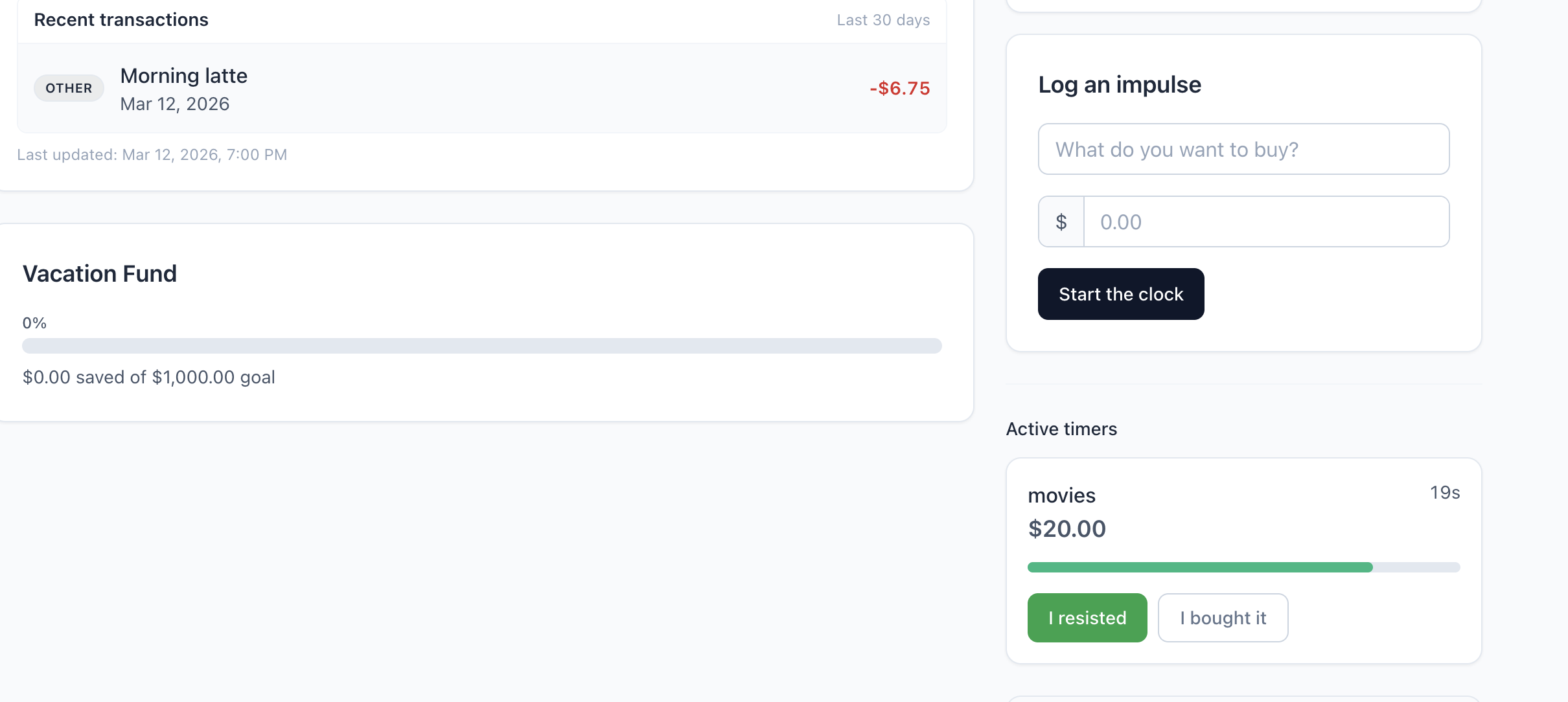 - Log something you want to buy and start a impulse control/delay timer (24 hours in production; 24 seconds in demo mode so judges can see the full loop live).