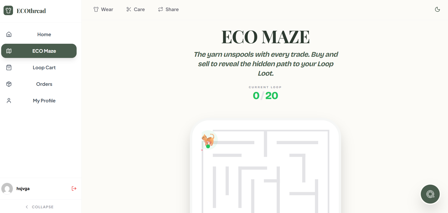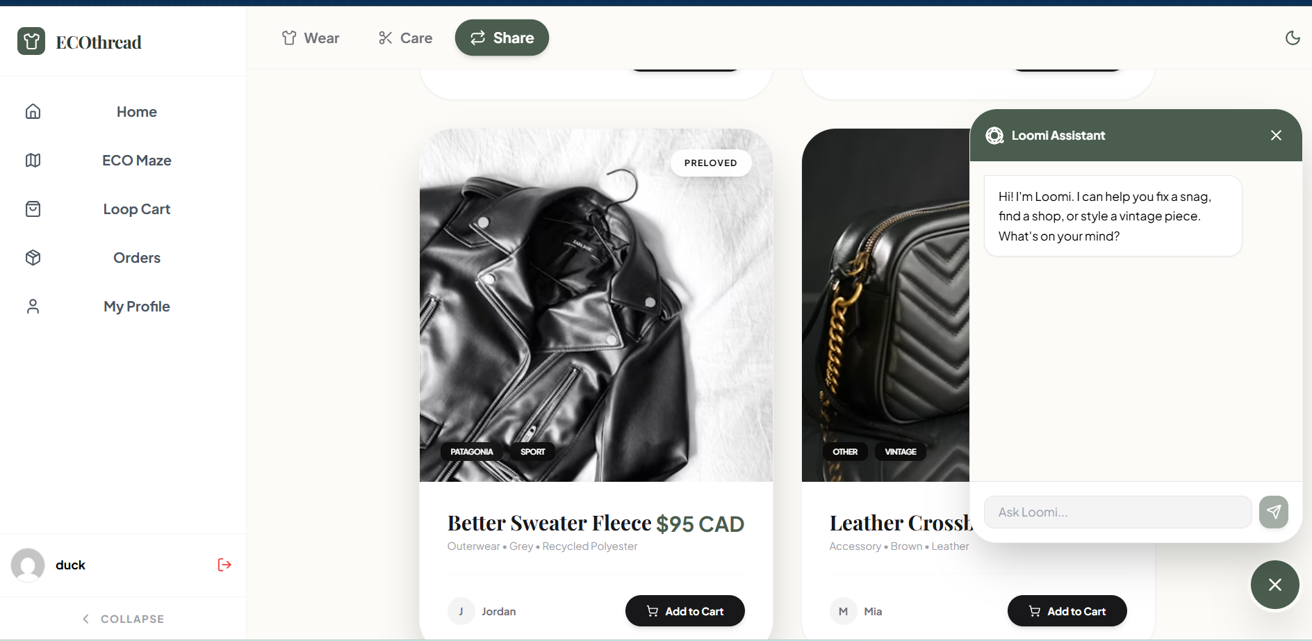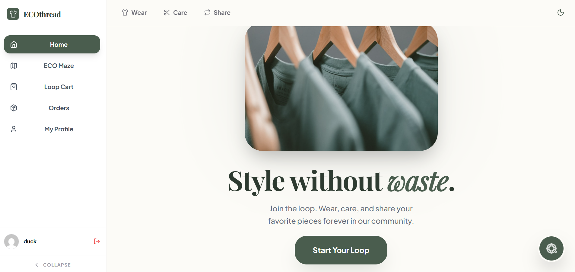 We didn't need another shopping app. We needed a support system where sustainability isn't a luxury, but a creative, accessible, and communal practice. That’s when the idea for EcoThread-Loop was born. We realized that sustainability shouldn't be a sacrifice; it should be a connection. We didn't want to just "buy less," we also wanted to share more.