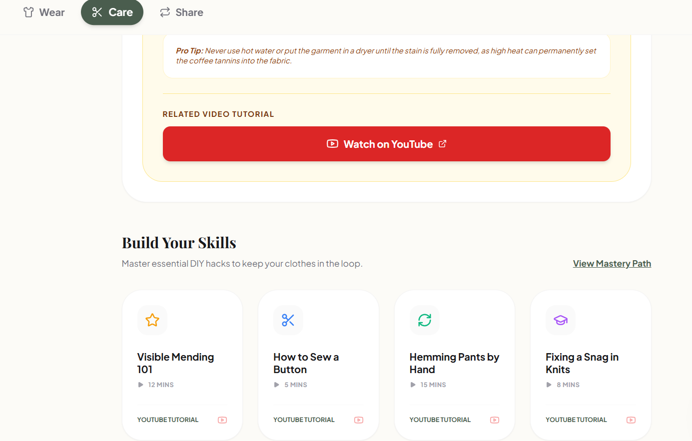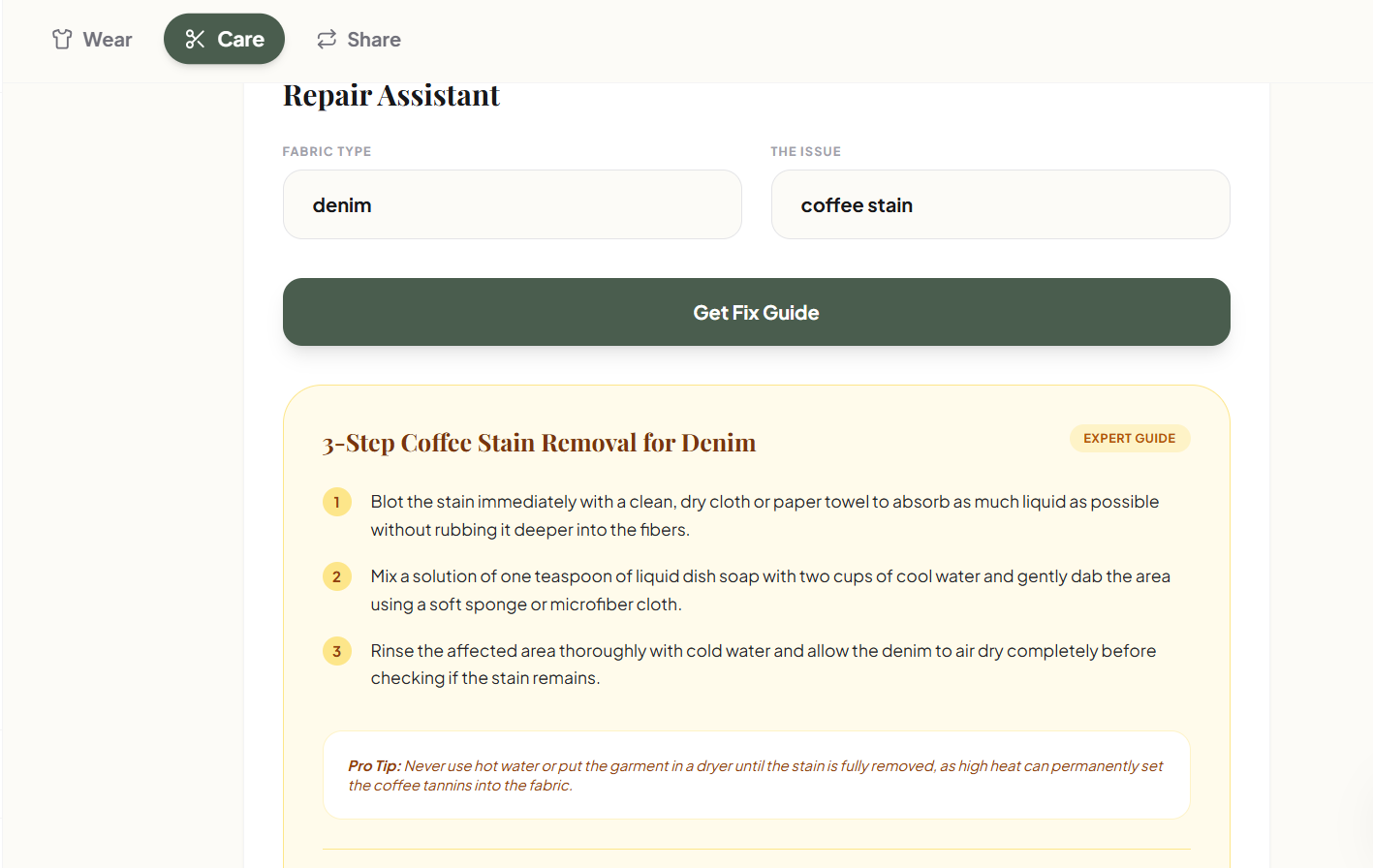 - Built a Complete Platform: Created three integrated features (AI Styling, Care & Repair, Marketplace) that work together.