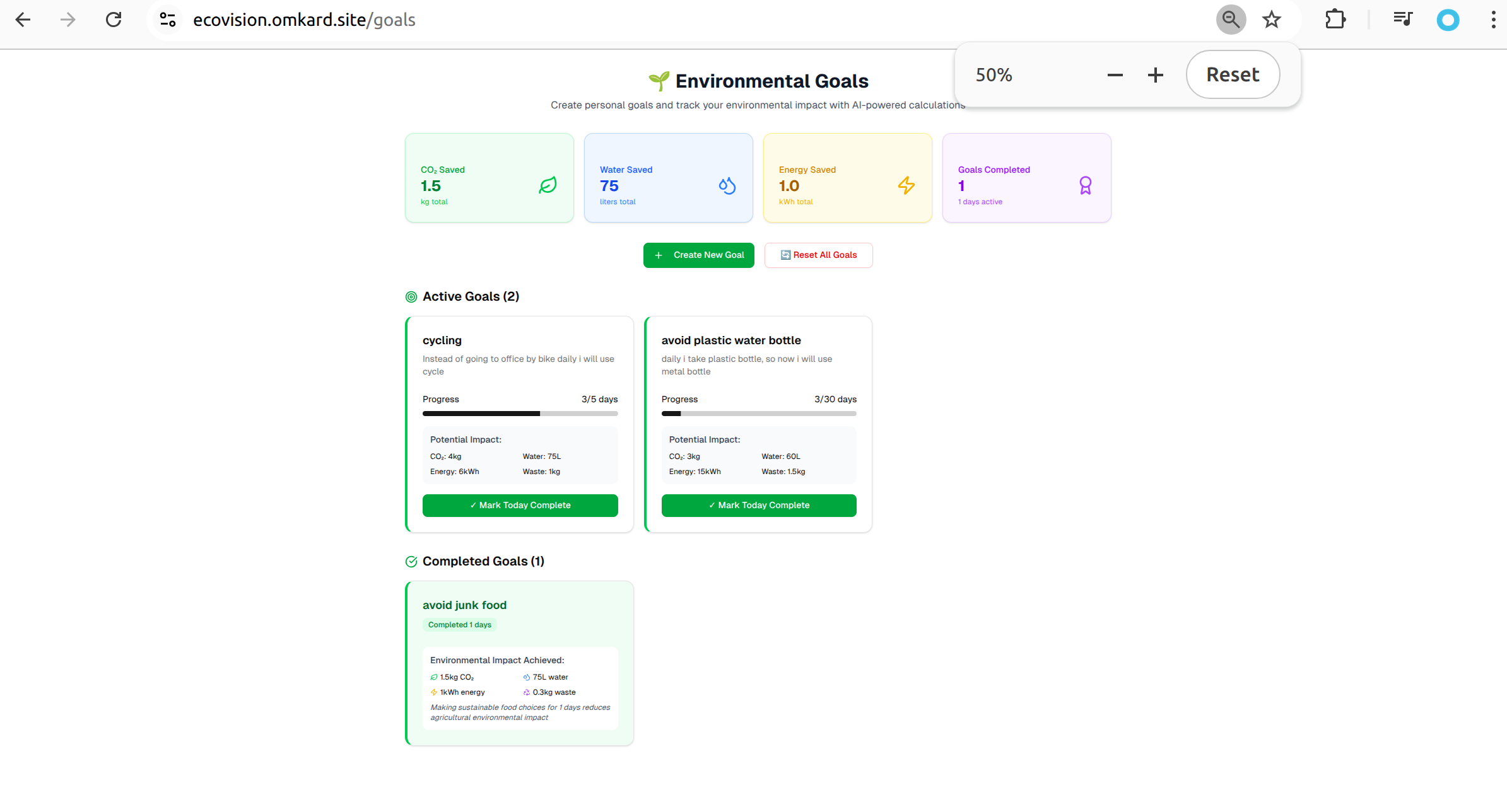 - Environmental Goals Tracker: Gamified goal setting with measurable impact tracking