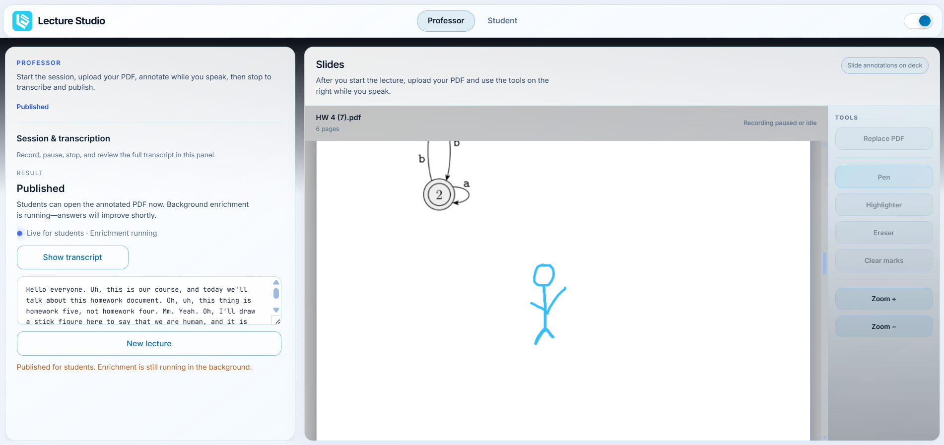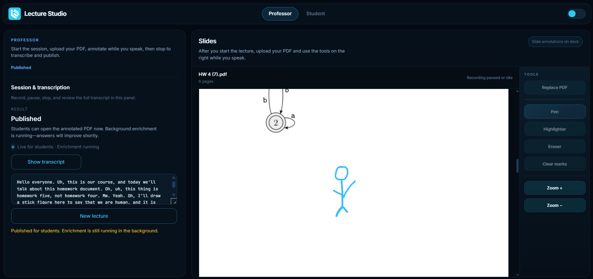 We ran Gemma 4 fully locally on device. After the lecture ends, Gemma 4 reads the transcription and every timestamped annotation the professor drew on the slides and builds a structured Lecture Memory from it. This means the AI knows not just what the professor said but what they were pointing at and when.