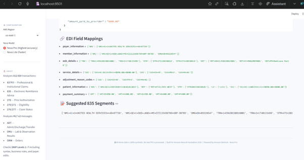 - Bonus multimodal mode: Upload scanned paper EOB/remittance images → Nova extracts key data → maps to EDI-equivalent issues and suggests corrections.