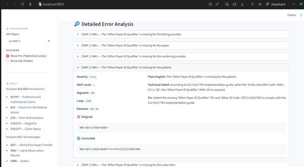 After 15+ years as a Senior Lead Engineer and consultant in US healthcare interoperability (X12 EDI standards like 837 claims/835 remittances/278 prior auth, HL7 v2, FHIR implementations), I've seen firsthand how manual EDI error troubleshooting wastes hours, increases claim denials, and burdens revenue cycle teams. Traditional tools validate syntax but can't provide contextual, payer-specific reasoning or plain-English explanations. Amazon Nova's advanced reasoning, multimodal understanding, and agentic capabilities inspired me to create an "AI doctor" for broken EDI files — turning complex debugging into fast, intelligent assistance.