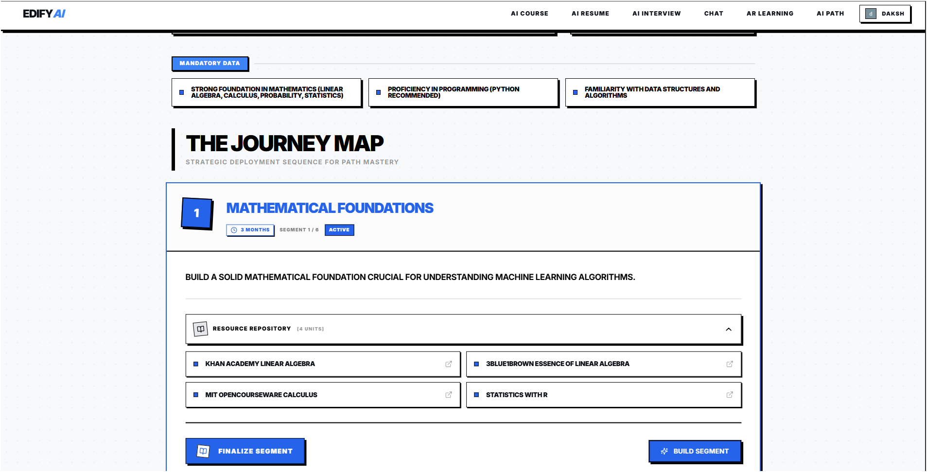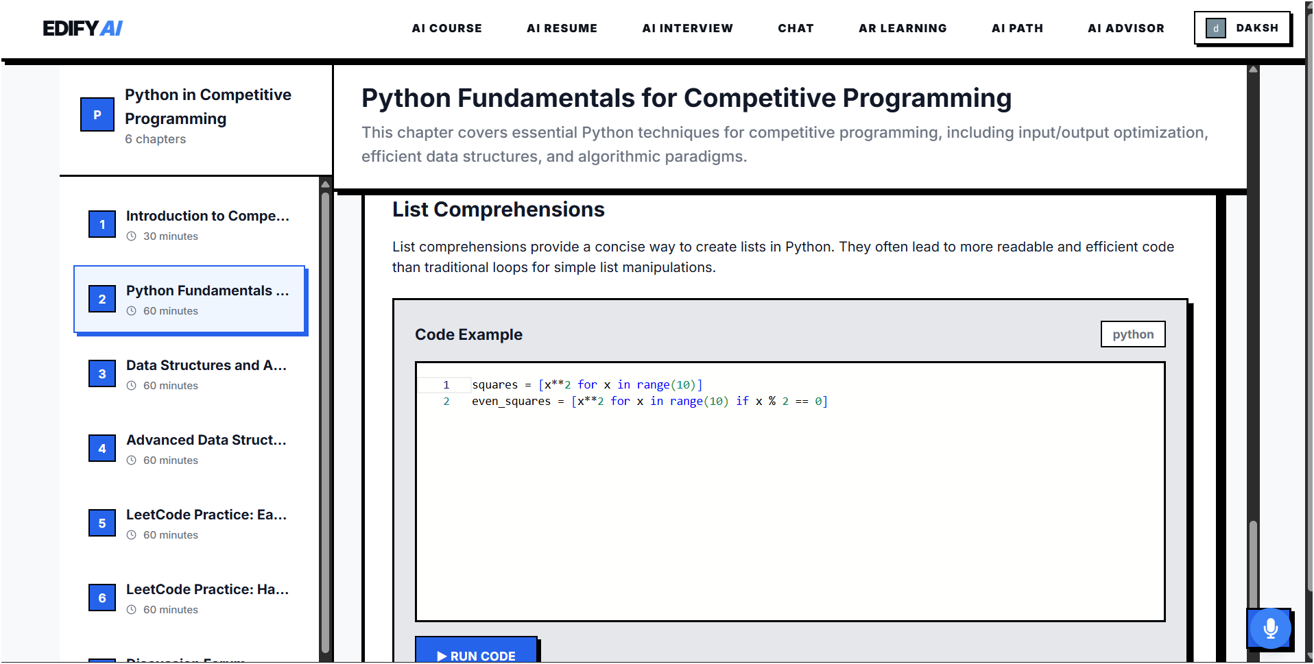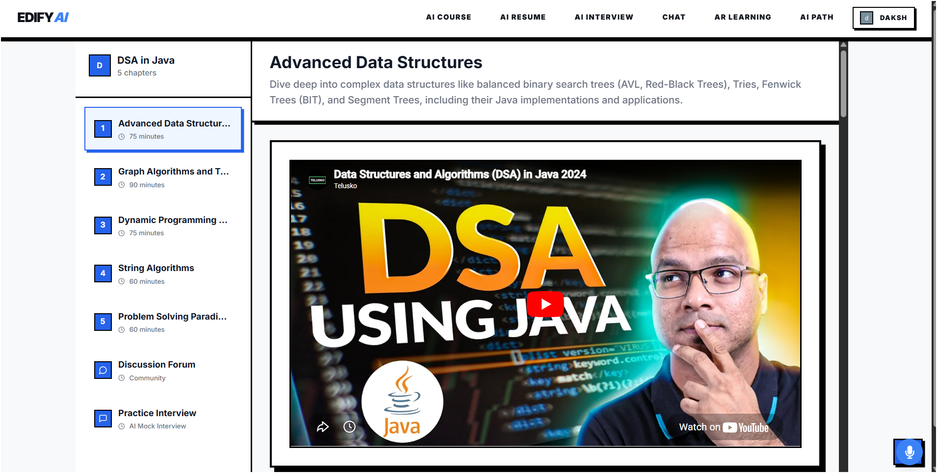 2. AI-Generated Course Creation For every step in your roadmap, Edify-AI assembles a complete, structured course from scratch — curated YouTube content with 85% relevancy scoring, chapter-by-chapter outlines, interactive quizzes, a code editor for hands-on practice, and discussion forums. No generic catalog browsing. Only what's needed for this skill, at this level, right now.