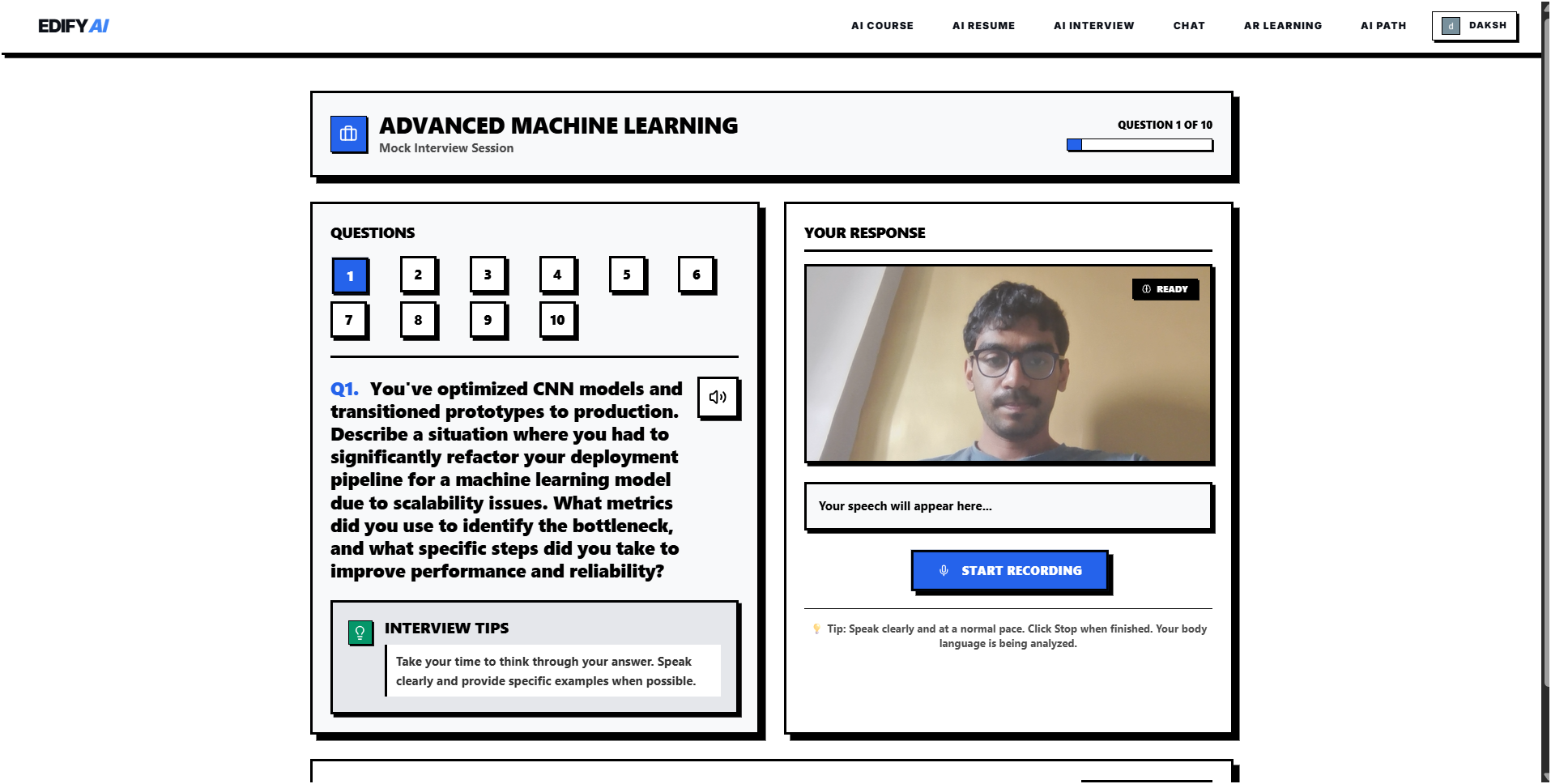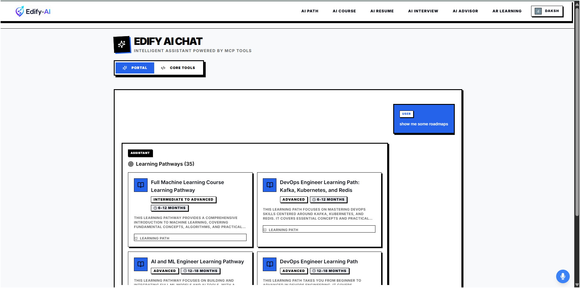 1. AI Video Teacher (Core Feature) The heart of Edify-AI is a conversational AI agent you can actually talk to — face to face, like a real tutor on a video call. It's not a chatbot. It's a live video agent powered by Gemini that understands your personal context: your skill level, your roadmap, your past sessions. You can ask it to explain a concept, challenge you with questions, or guide you through what to do next — and it responds conversationally, remembering everything about you. It reroutes the lesson in real time based on your replies.