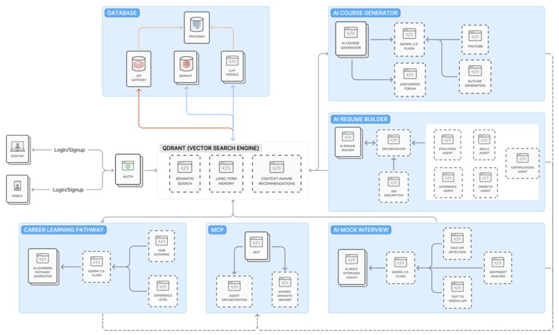 - Gemini 2.5 Flash — core reasoning engine across all agents (roadmap generation, course creation, resume analysis, interview feedback, and the live video teacher)