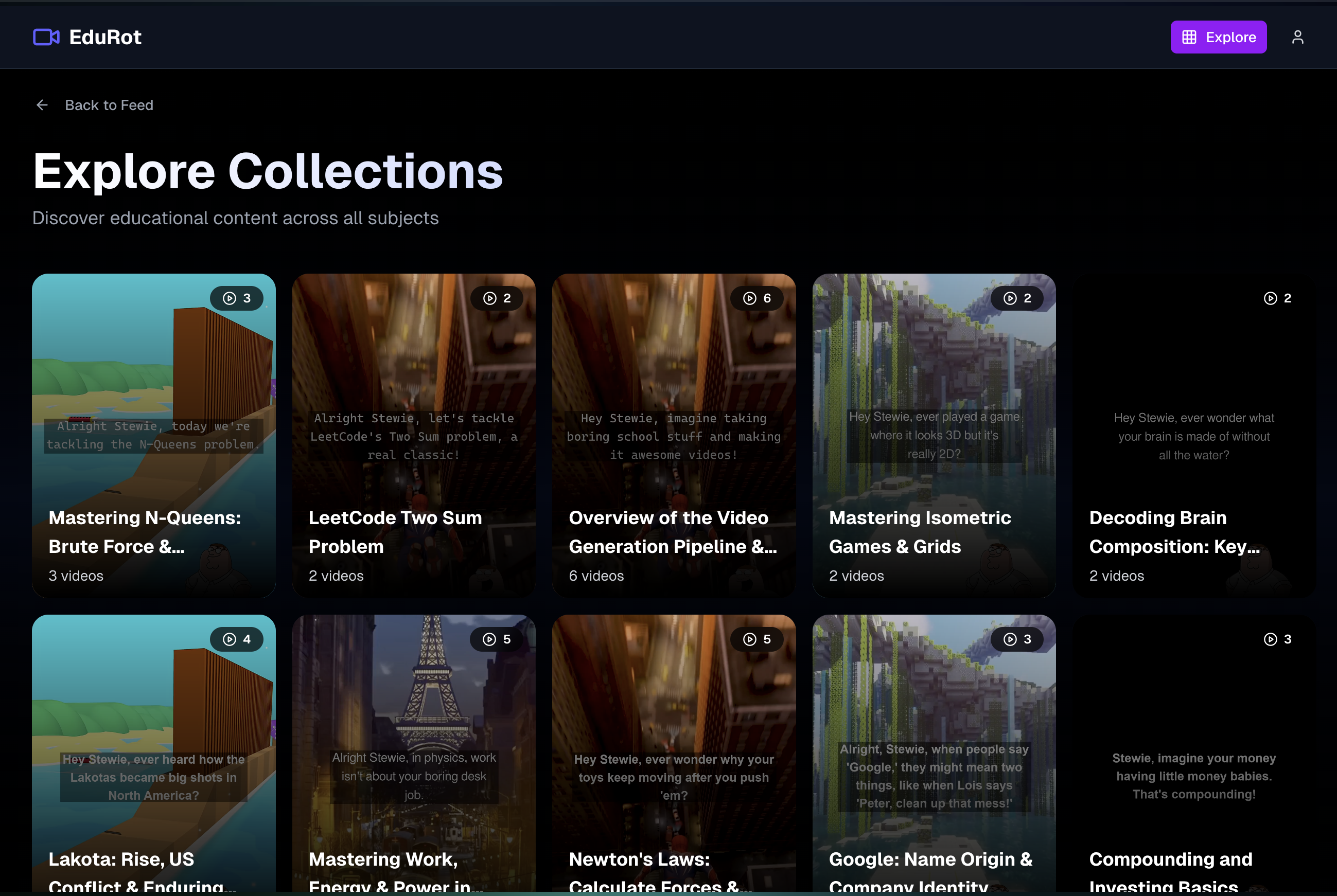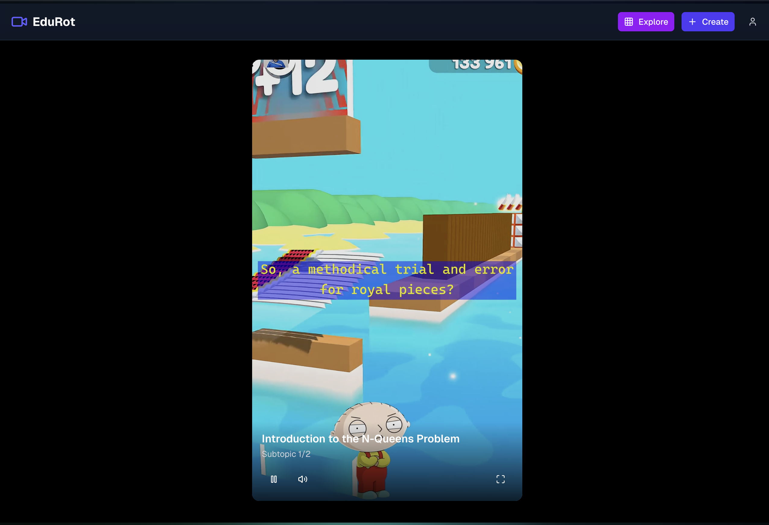 Take in a user input (text, YouTube video, lecture audio) and extract the most important subtopics, compiling these subtopics into a series of distinct short-form (TikTok brainrot-style) videos depicting Peter and Stewie Griffin from Family Guy comically discussing the subject matter. This is then followed by a short-form quiz, ensuring our users can both gain a fundamental understanding of the subject matter and test their knowledge in real-time, all while being thoroughly entertained by Family Guy antics.