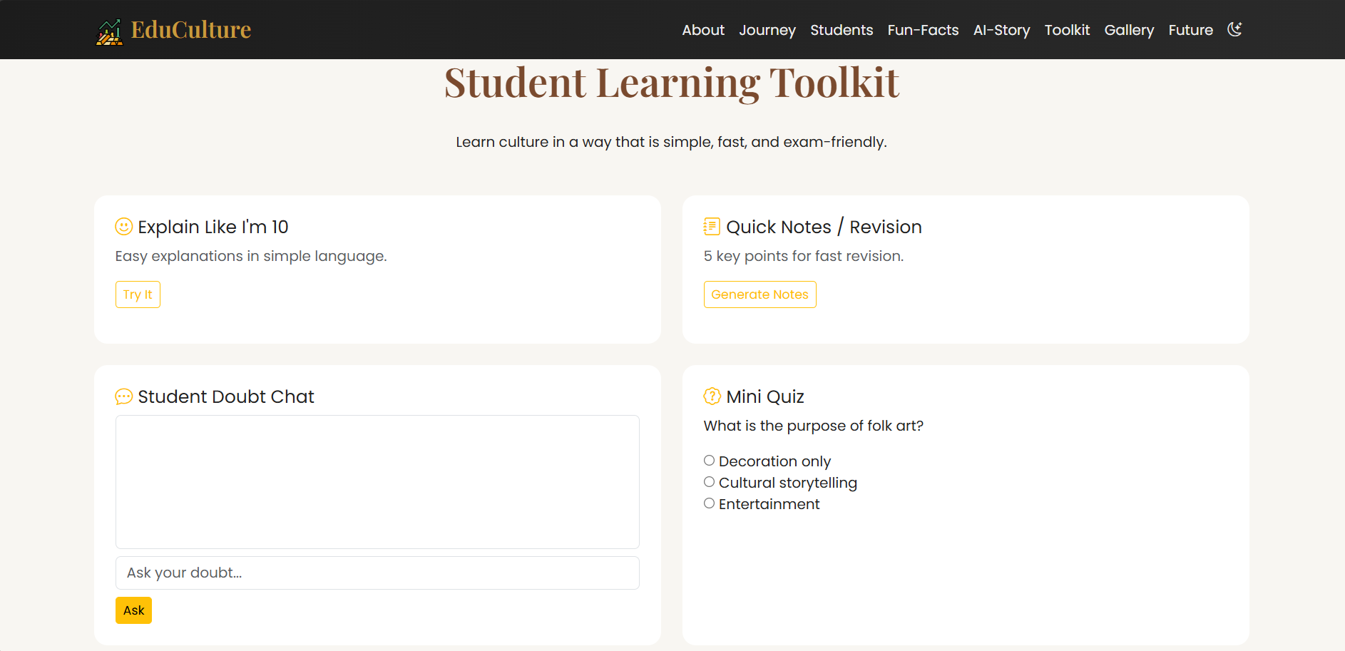 EduCulture is a web-based cultural learning platform designed especially for students. It transforms complex cultural topics into easy-to-understand visual stories, helping learners grasp concepts quickly and retain them longer.